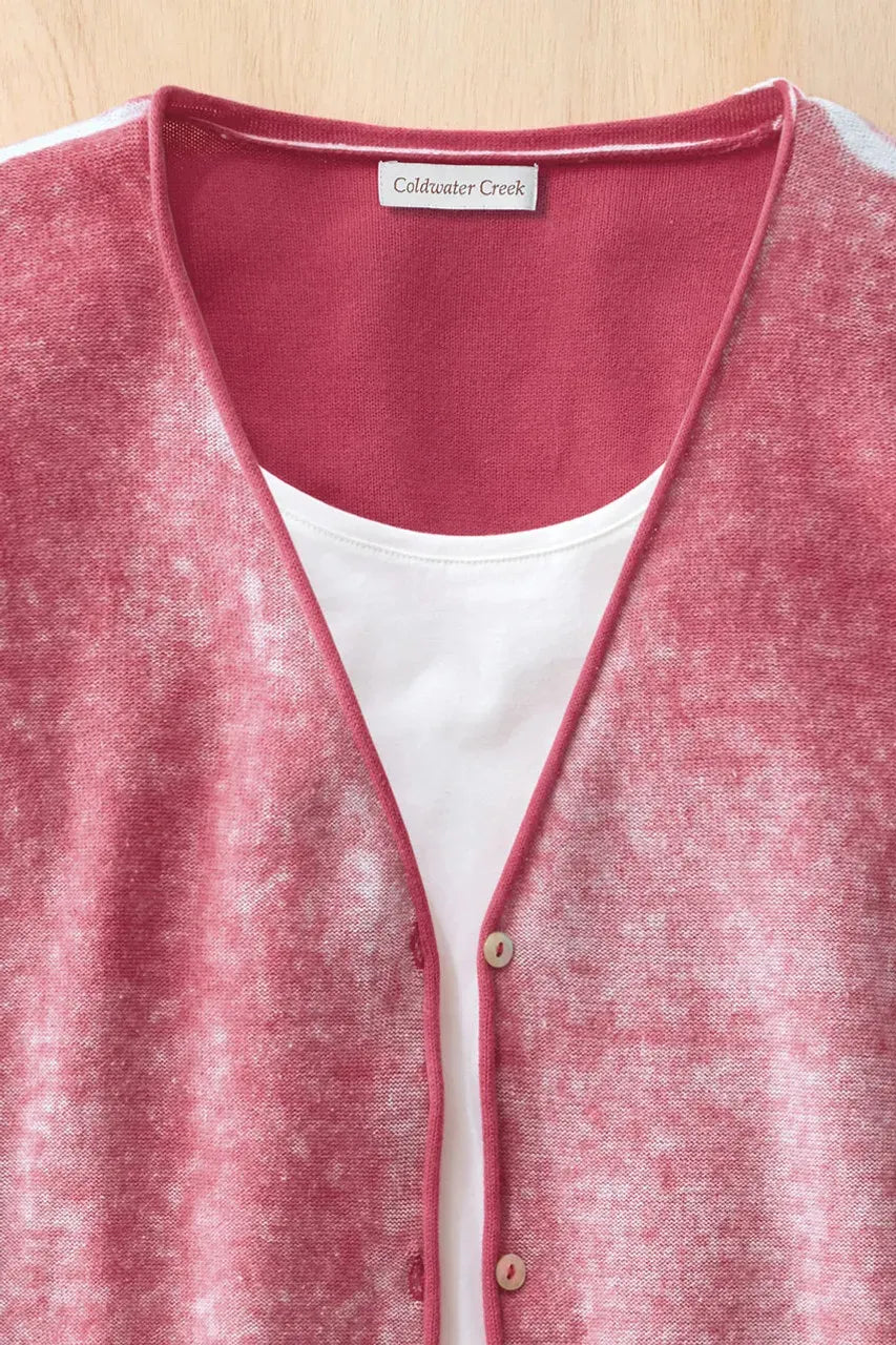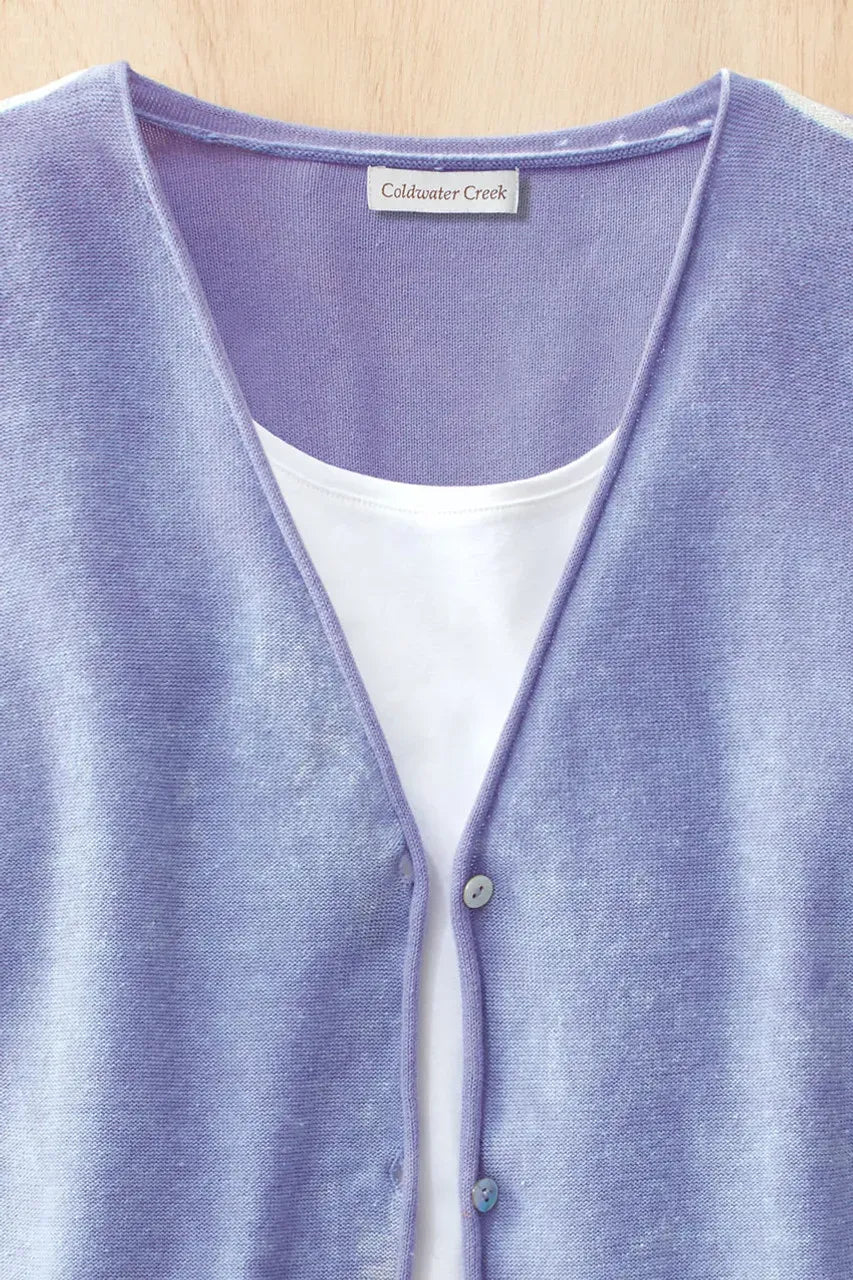 This lightweight cardigan makes color an art – uniquely dyed for a vintage vibe, so each sweater is one of a kind. Soft and drapey, it’s highlighted with accent seams and rolled edges.