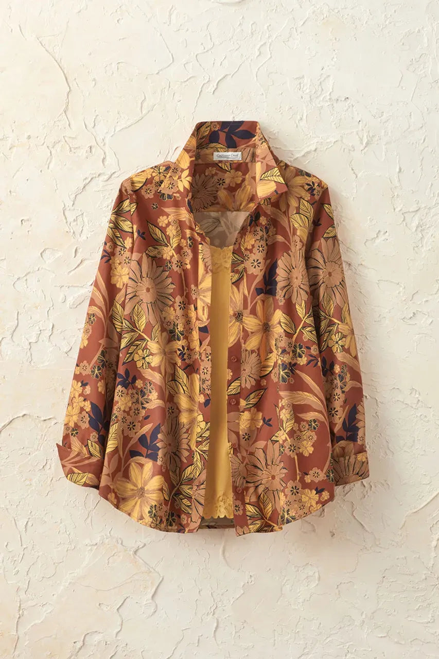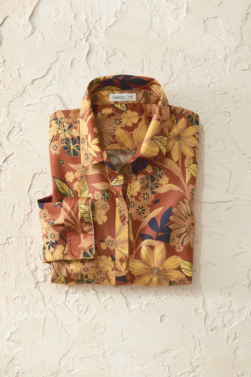 The warm-hued floral print No-Iron Shirt in midweight, wrinkle-free, easy-care cotton goes from dryer to out-the-door with effortless ease. Its versatile design maintains a fresh, crisp look throughout the day for confident style you can count on. The shirt's crease-resistant wear makes it an essential for work, weekends, and travel. Features reinforced placket for durability, curved hem, and long sleeves with button cuffs. Slightly shaped fit, hits low hip.