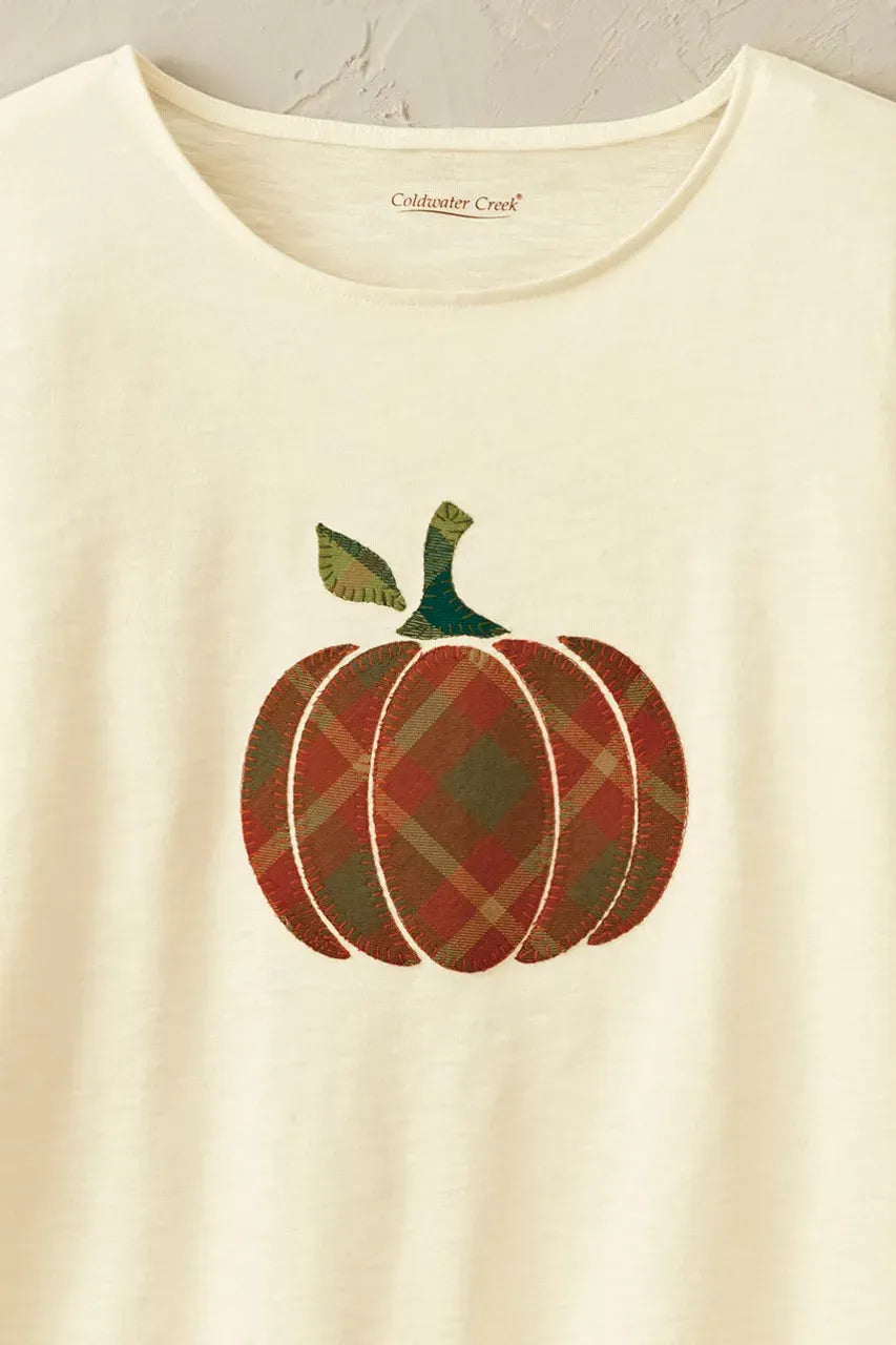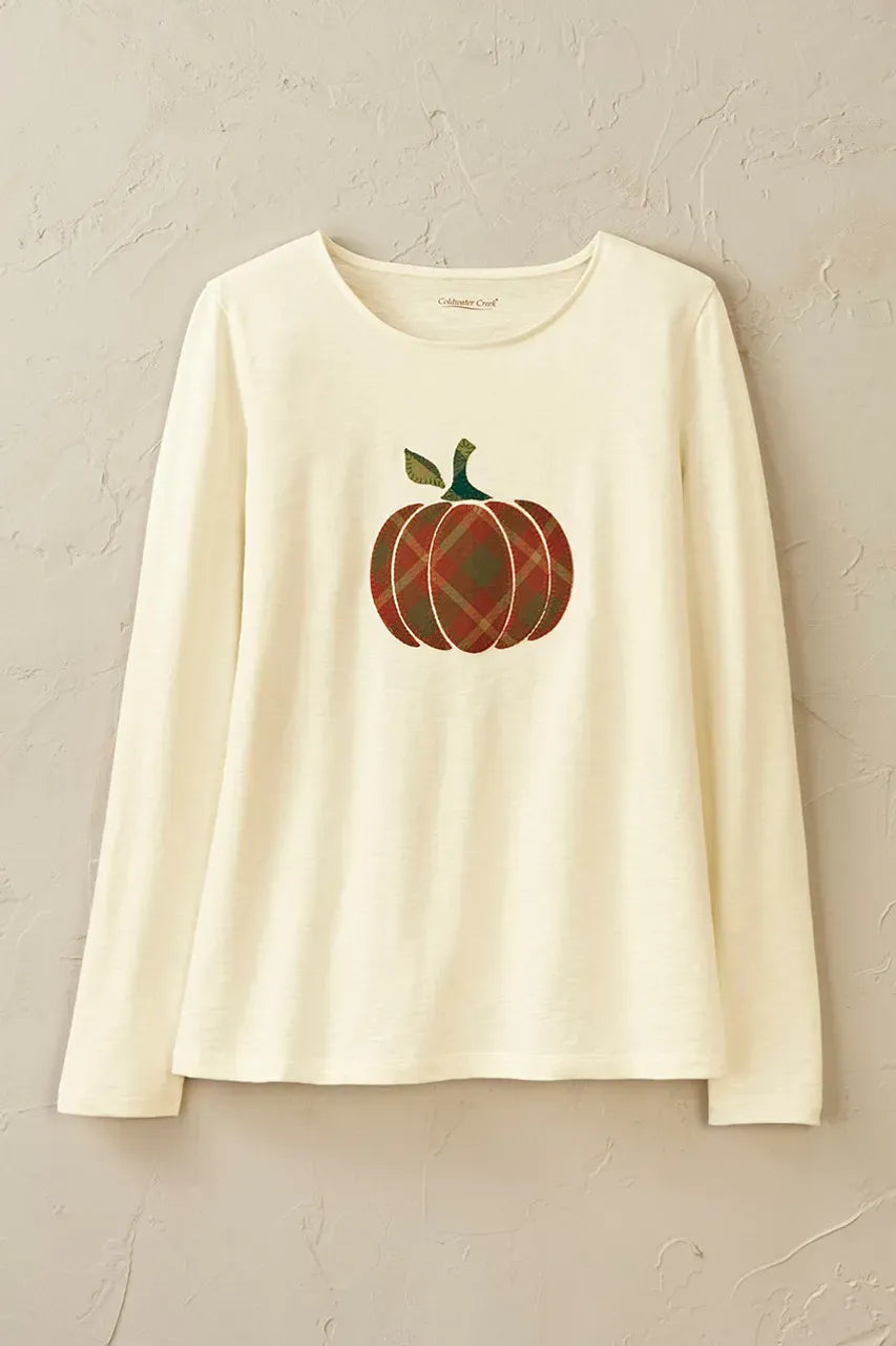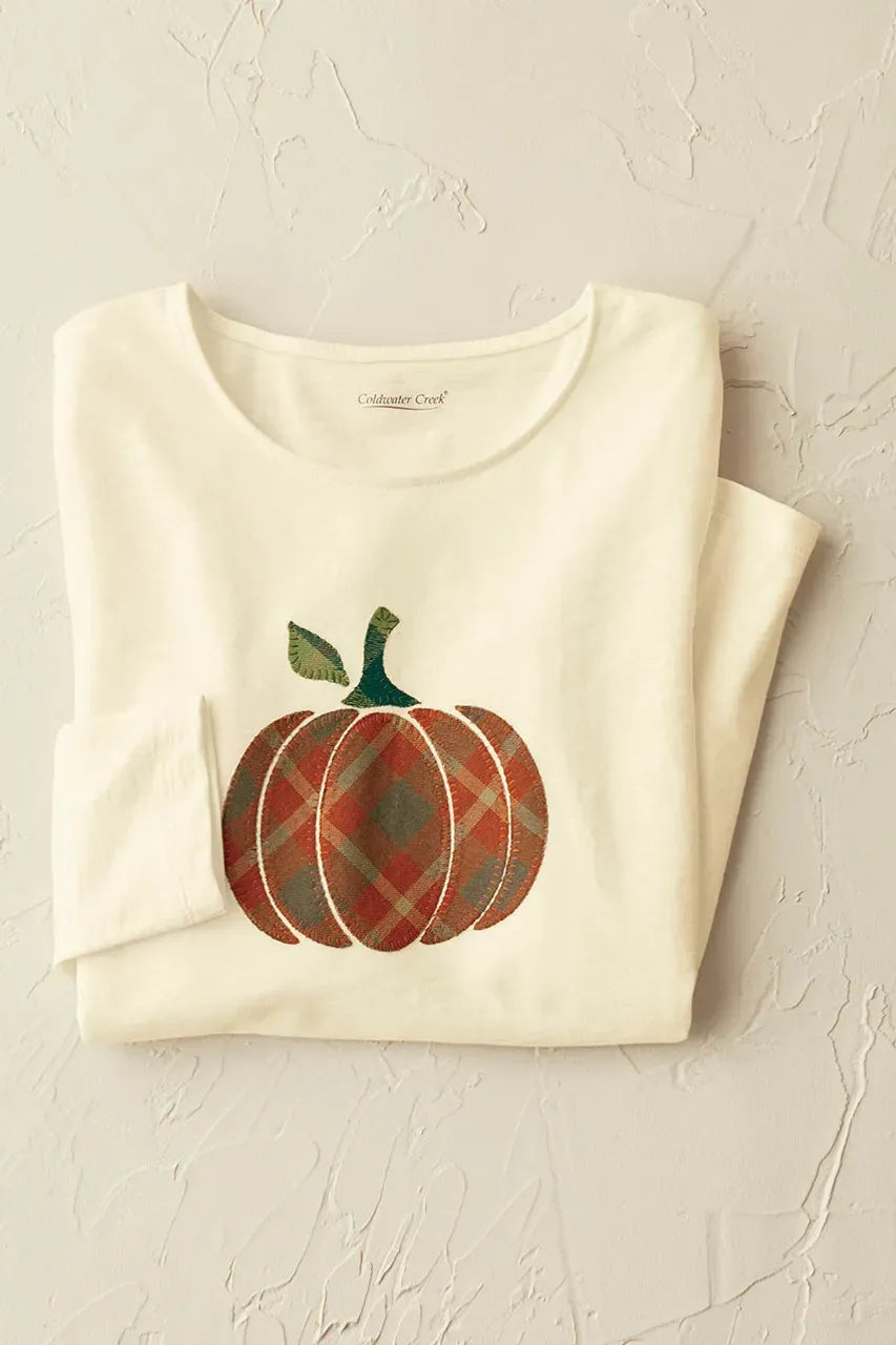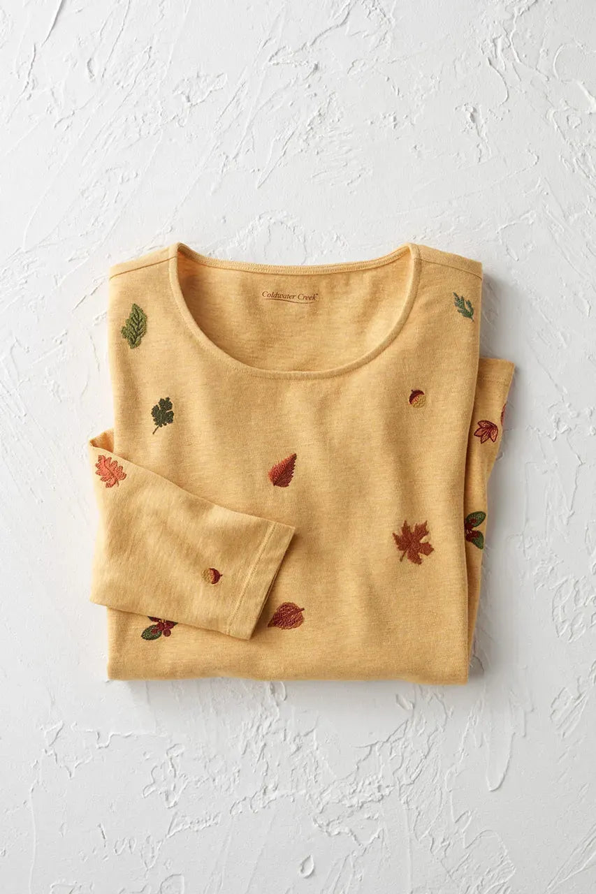 Product Description These lightweight cotton tees feature seasonal appliqué and embroidered designs perfect for layering with vests or jackets. Choose from an appliquéd pumpkin, embroidered wildflowers or embroidered fall leaves (on front and sleeves). Soft slub knit with jewelneck, long sleeves and straight hem.