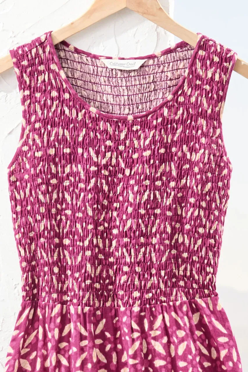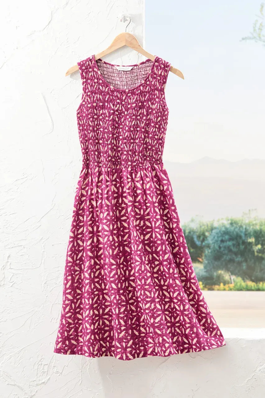 Our cotton gauze dress is airy and breathable, in a comfortable silhouette with a smocked bodice and lively batik geo print. Shirred waist seam opens into a soft, flowing skirt with side-seam pockets.