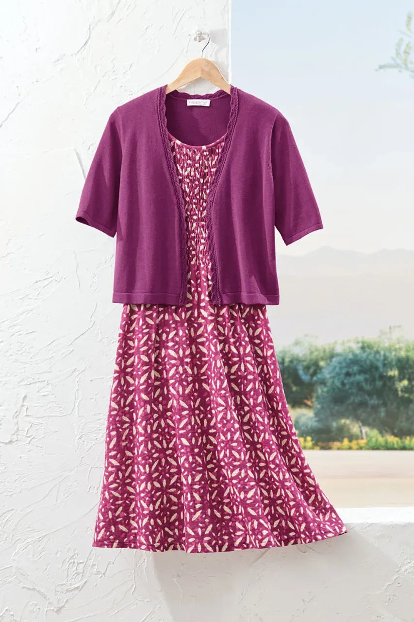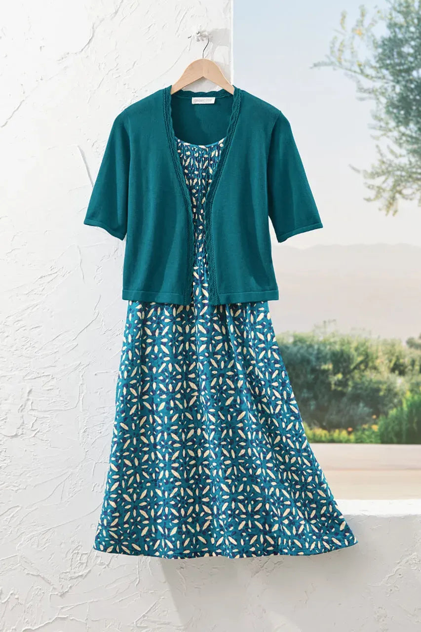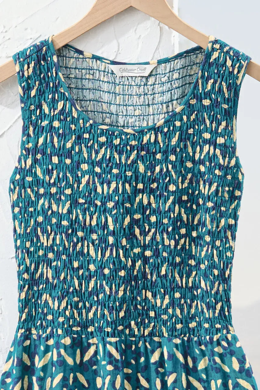 Product Description Our cotton gauze dress is airy and breathable, in a comfortable silhouette with a smocked bodice and lively batik geo print. Shirred waist seam opens into a soft, flowing skirt with side-seam pockets.