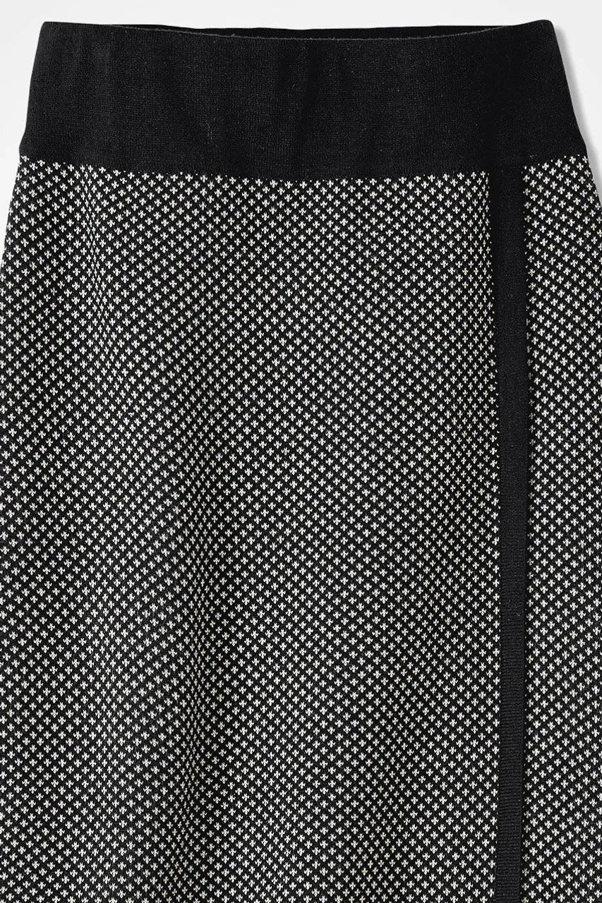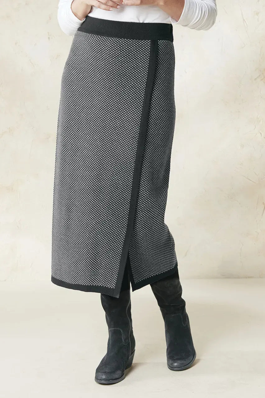Product DescriptionSoft yet sophisticated, this bird's-eye sweater skirt has the look of a wrap, with side stitching and solid trim. Flattering cut creates a slimming visual effect. Midweight with 43" sweep.