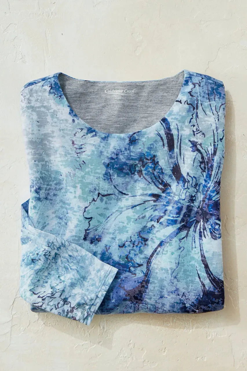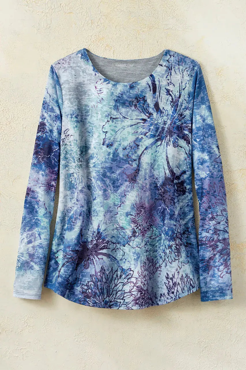 Like a sky-full of flowers, this artful print gains depth on our lightly textured burnout fabric. Lightweight, with long sleeves and lined body.