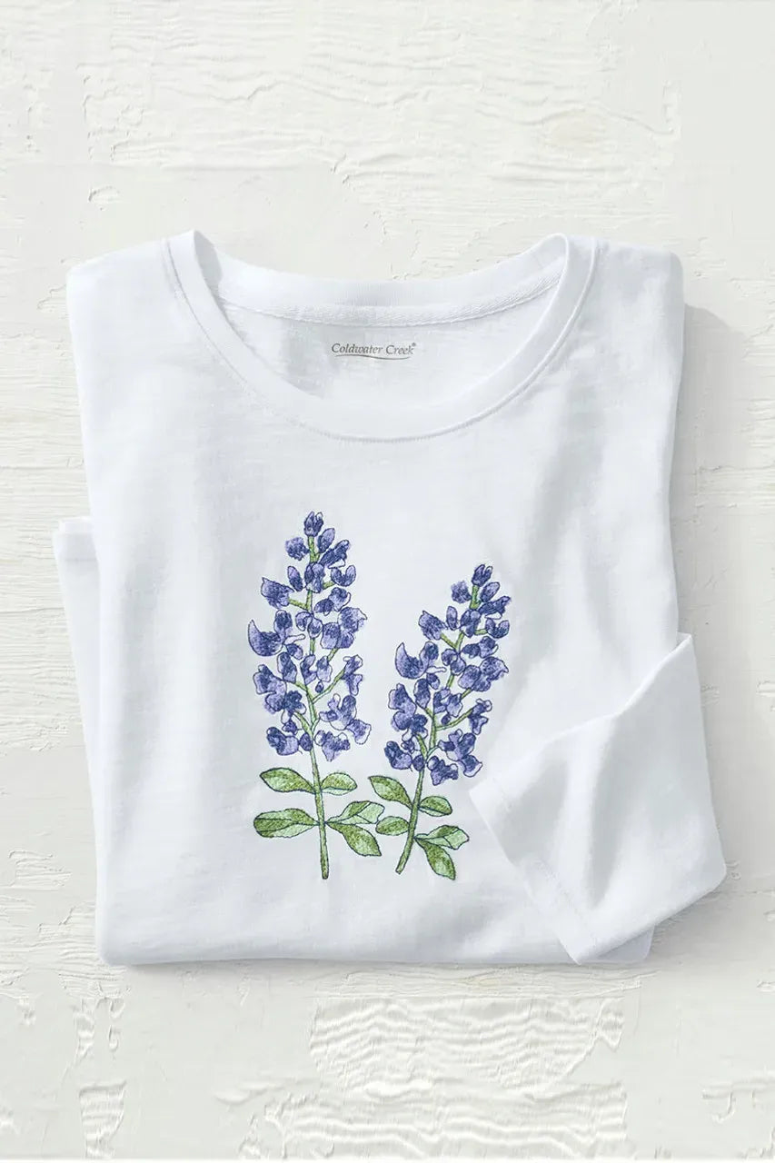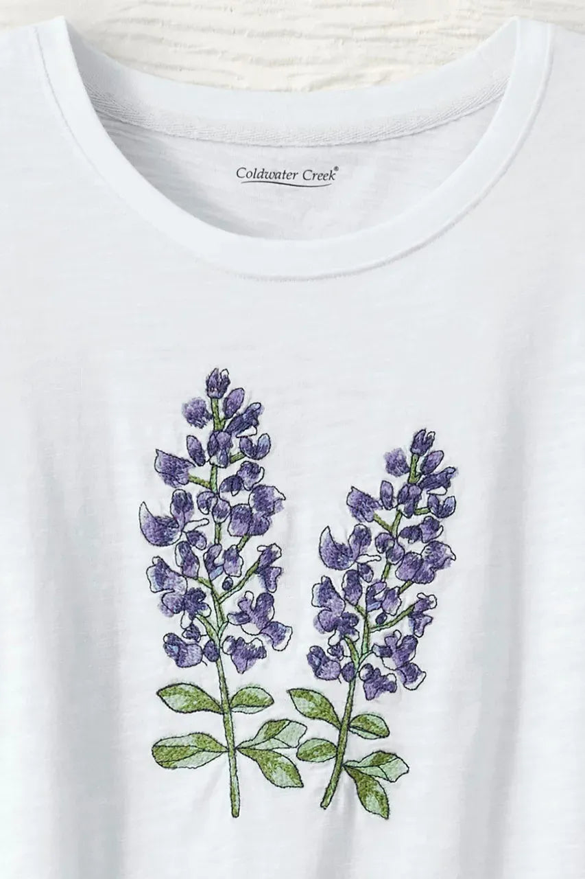 Natural artistry, in an ode to spring. Embroidered bluebonnet flowers add a painterly look on this soft slub knit tee. 3/4 sleeves and side-slit curved hem.
