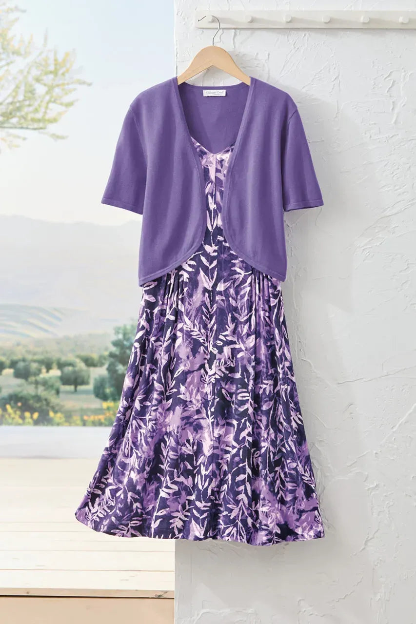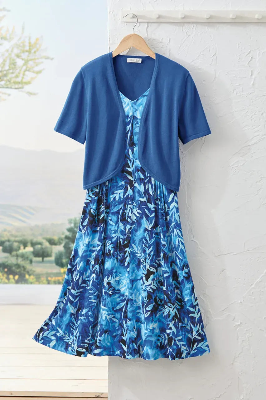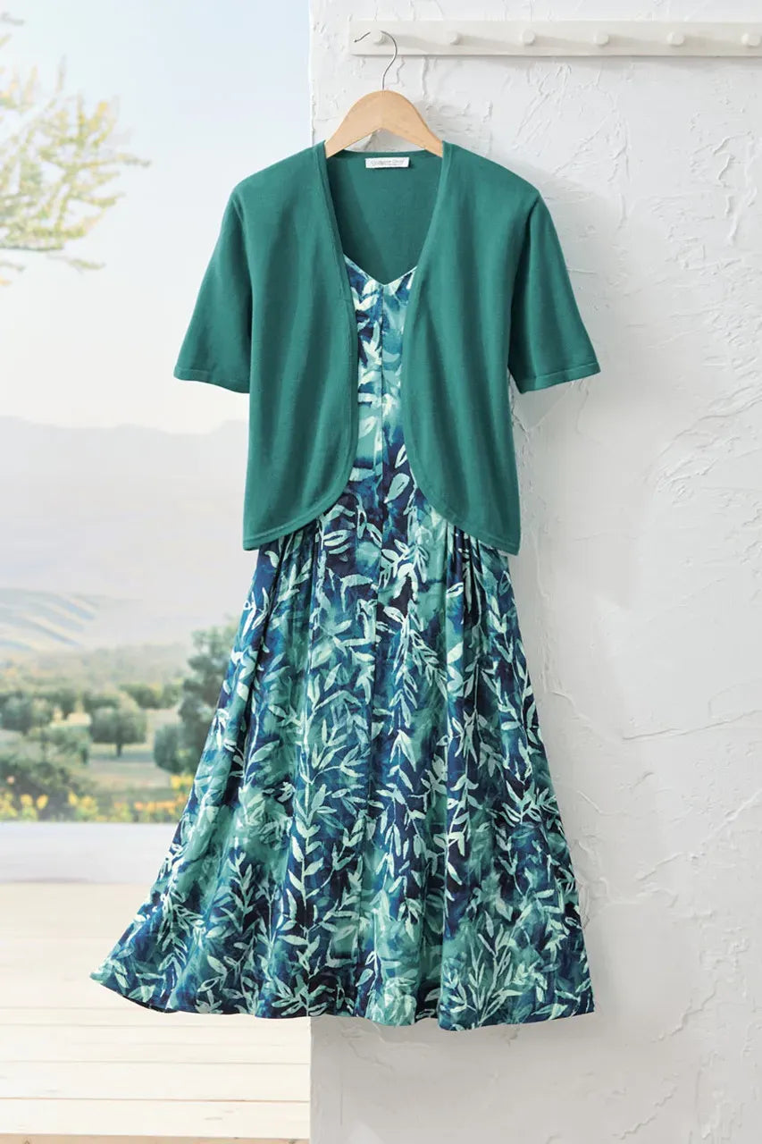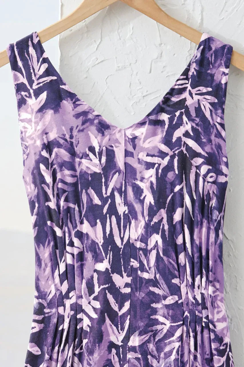 Our colorful, botanical-print dress in soft stretch jersey drapes beautifully from pleats in front and back. This perennial favorite is now in a fun new length that hits at the knee! Slipover style with V-neck, center seams on front and back, lined bodice.