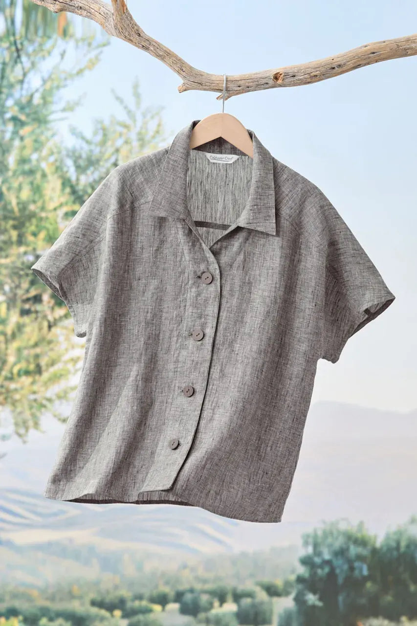 Our button-front, short-sleeve linen top demonstrates simple artistry with a natural touch. Lightweight and breathable in natural European-grown linen, and cross-dyed for beautiful color depth – it’s a step above casual. Dolman sleeves with front and back shoulder seams.