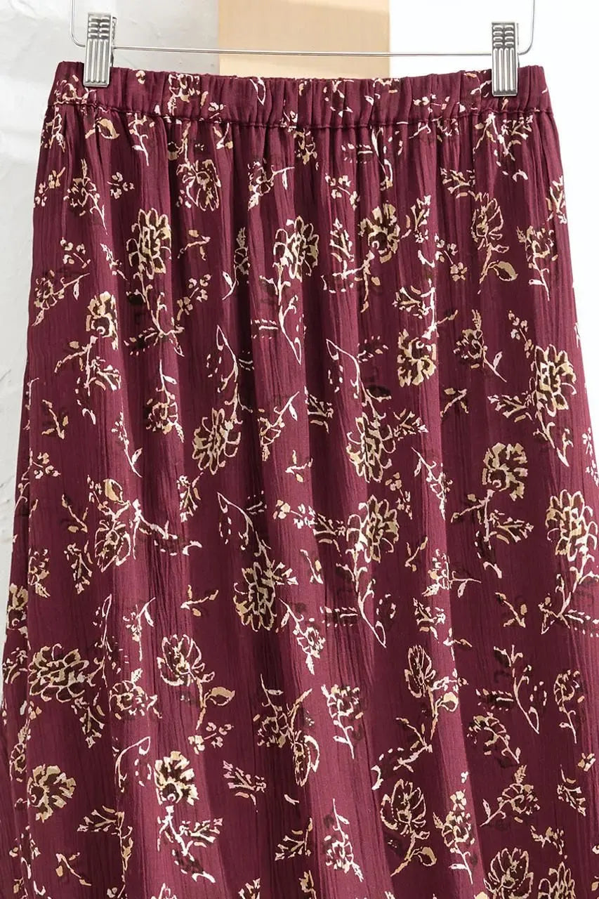 Product Description Pull-on crinkle skirt in lightweight rayon gauze creates effortless style with easy movement. This versatile skirt can be styled casually, for work, and for going out. Features delicate botanical border print, side-slit hem, and full elastic waist for comfortable fit. 56" sweep, hits at ankle.