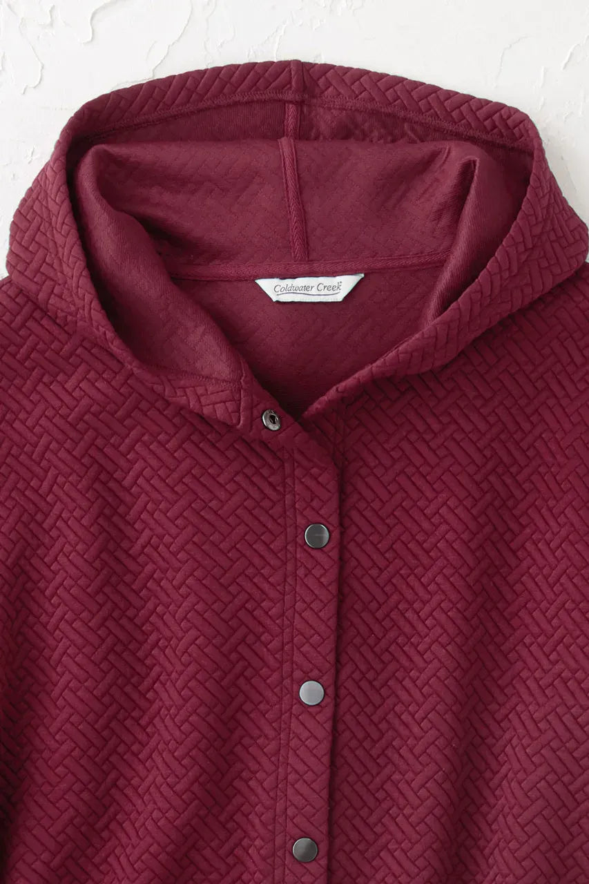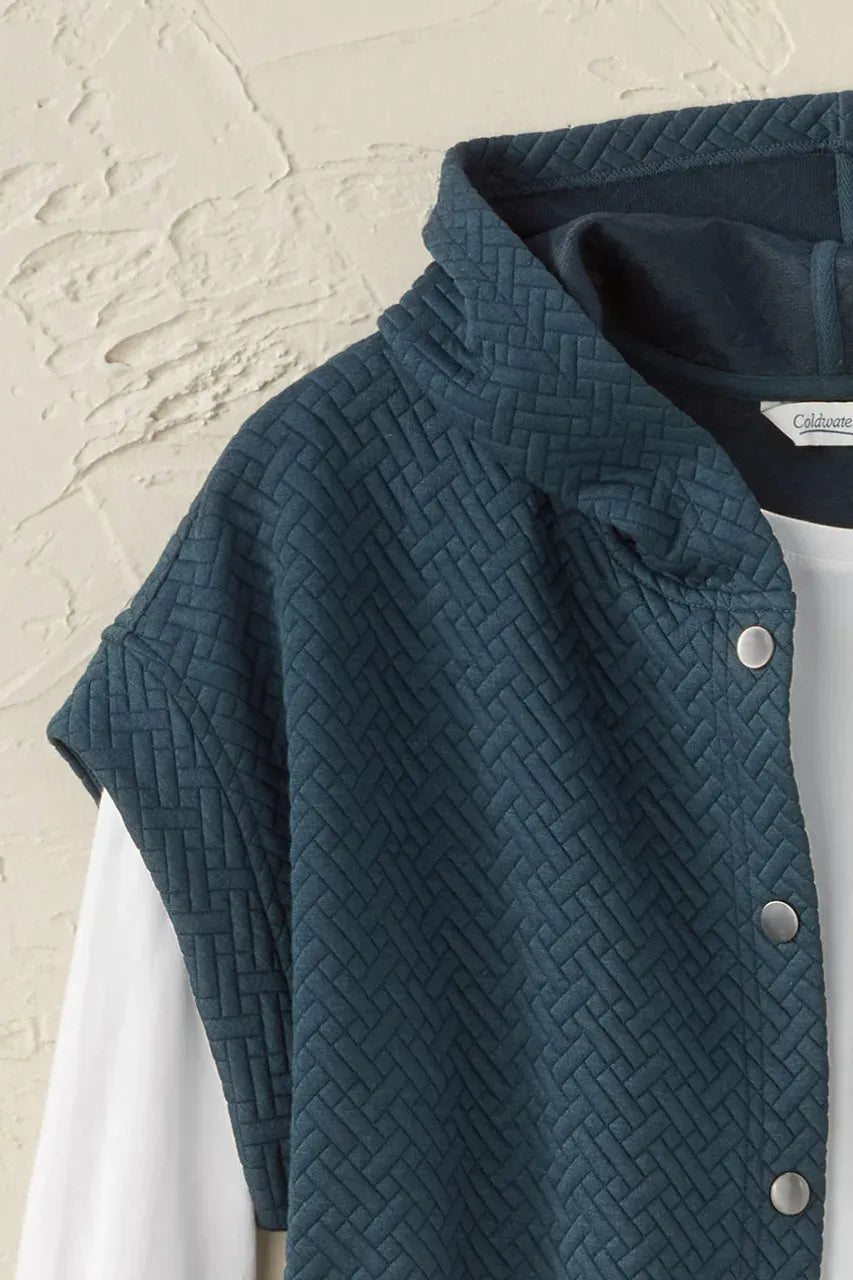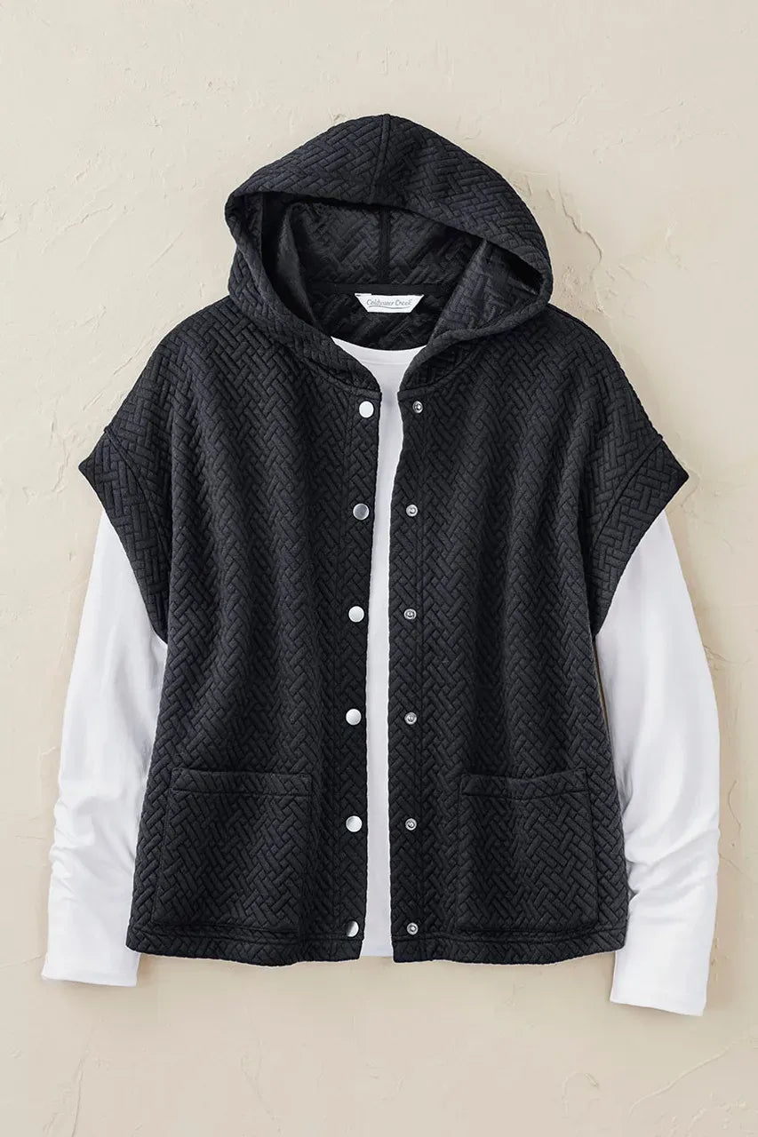 Product Description Refresh your layered look with this fun new vest, ideal for a little extra warmth. Soft, snap-front style is quilted all over, with a hood, roomy dolman cap sleeves and patch pockets. Side-slit hem.