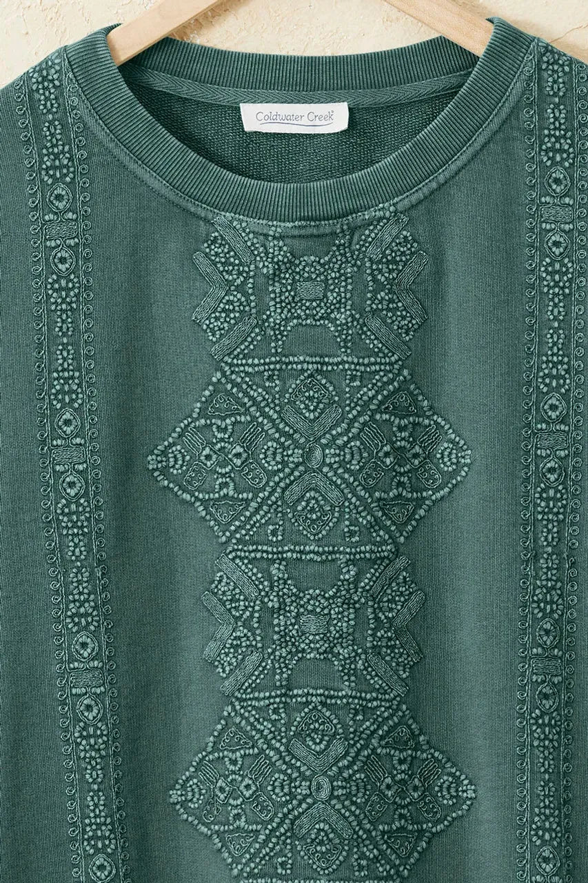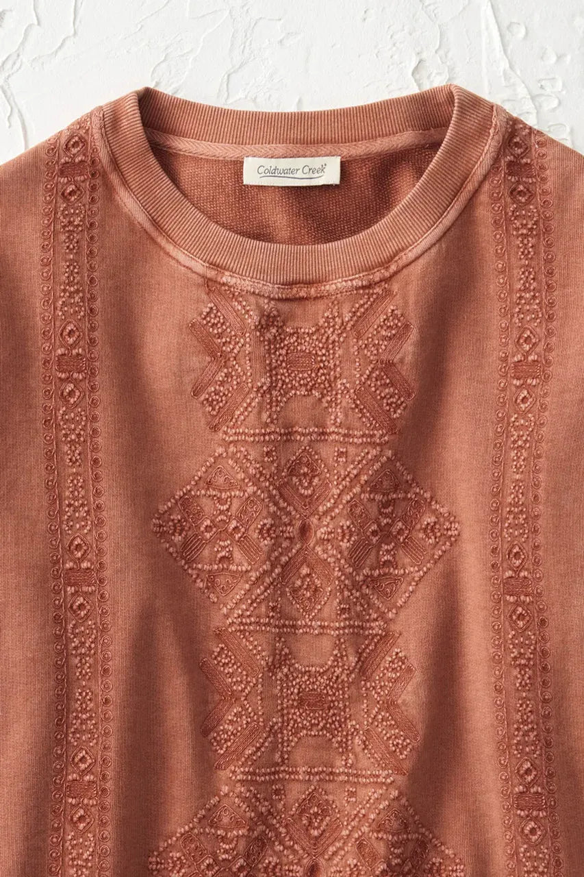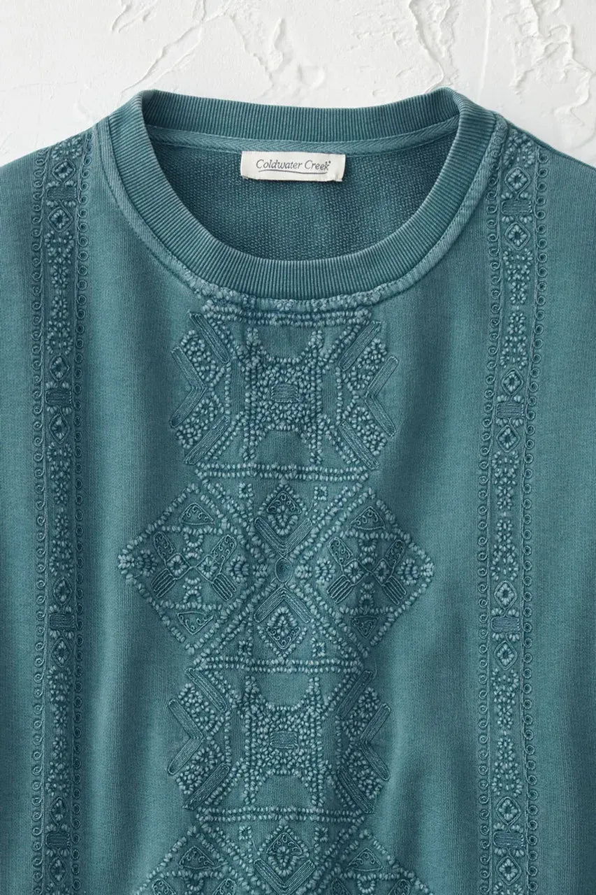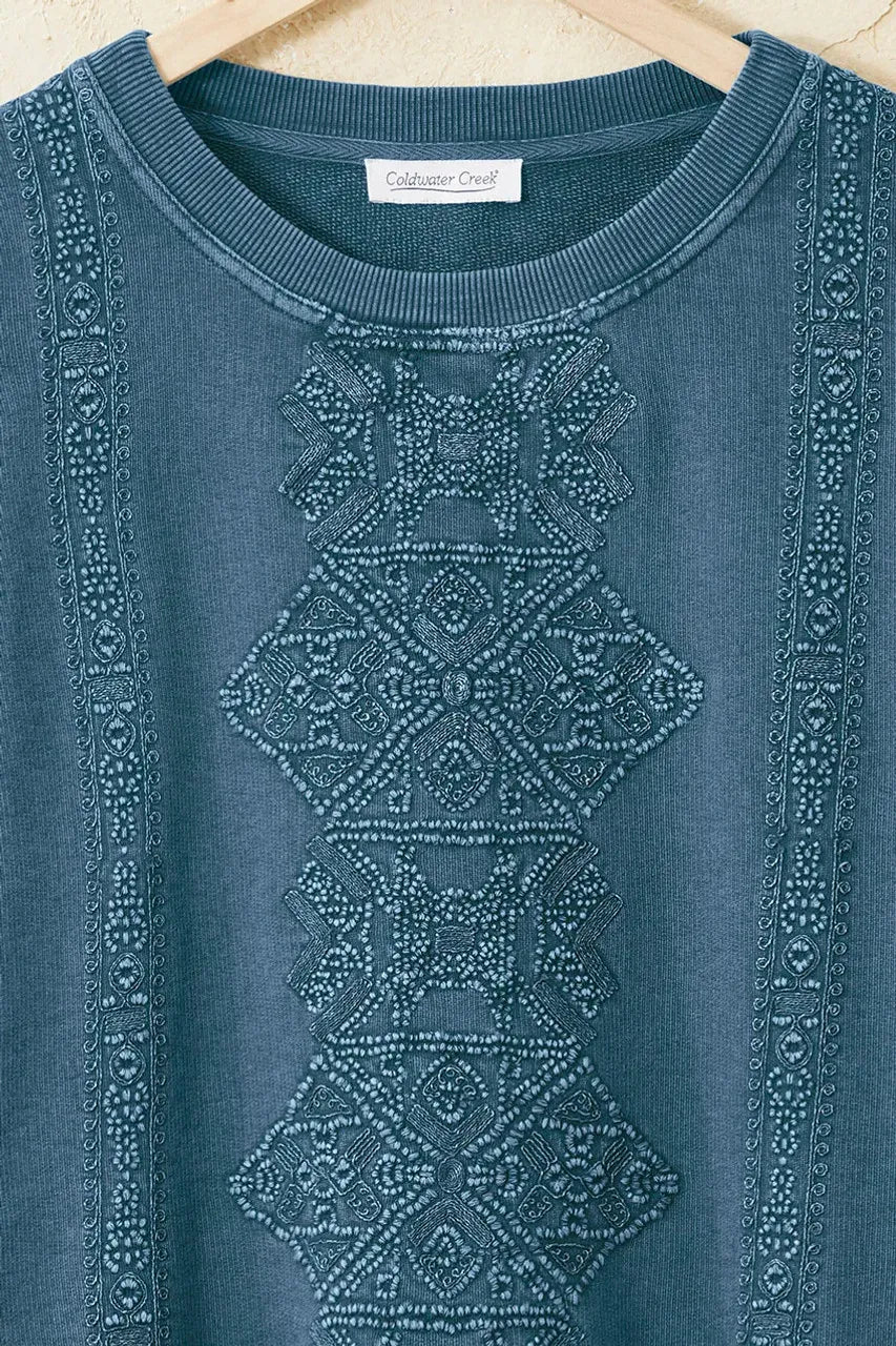 Feel right at home in this artful pullover, in comfy French terry embellished with intricate tonal embroidery and vintage-washed color.