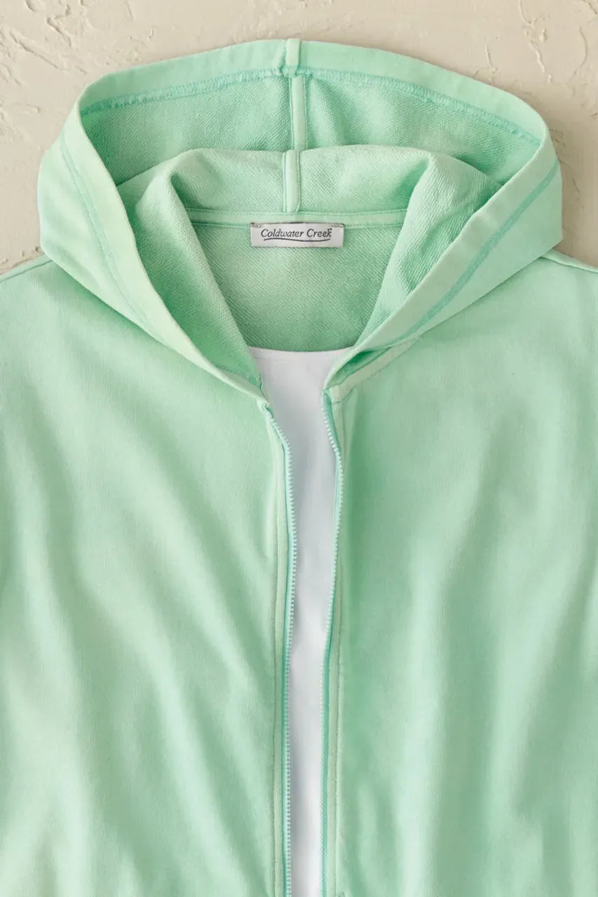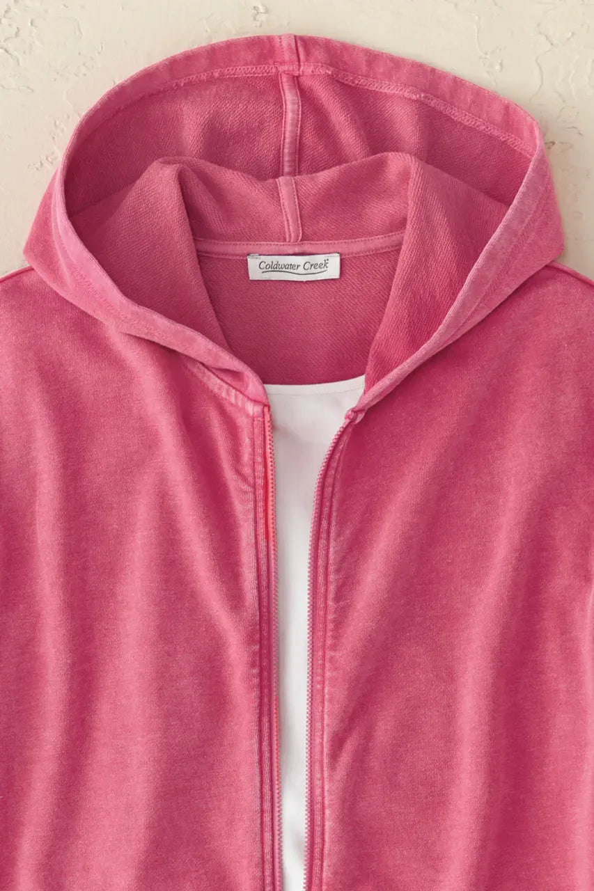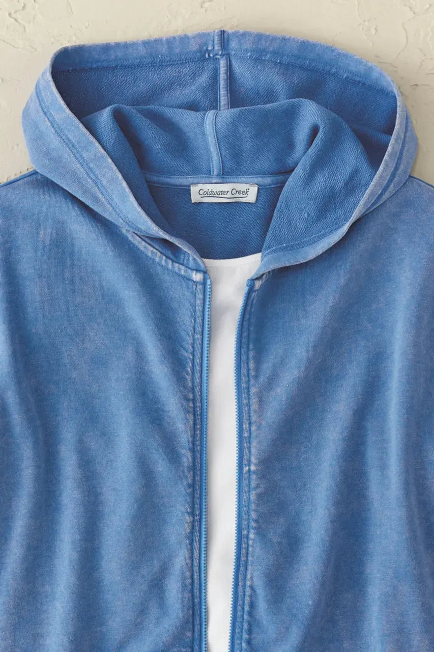 Product Description Anytime is colorwash time! Our favorite vintage-washed sweatshirt is ready for a new season in this fun, versatile silhouette. Lightweight hooded style has a front zip and extended-shoulder cap sleeves for easy layering. Ribbed trim, slit hem.
