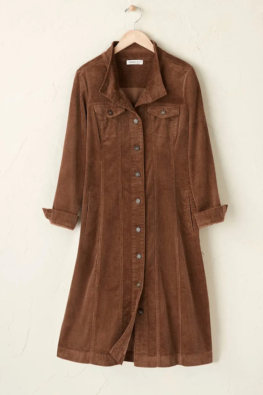 Product Description Count the ways you’ll wear it. Our soft-stretch corduroy dress can be worn alone or open as a duster, and the neckline can be left open or buttoned up as a mockneck. Button front with vertical seaming, side and chest pockets.
