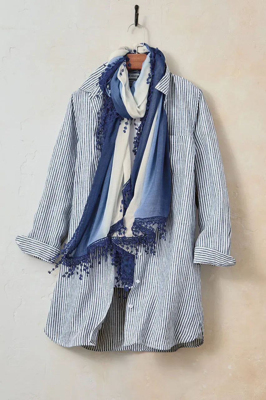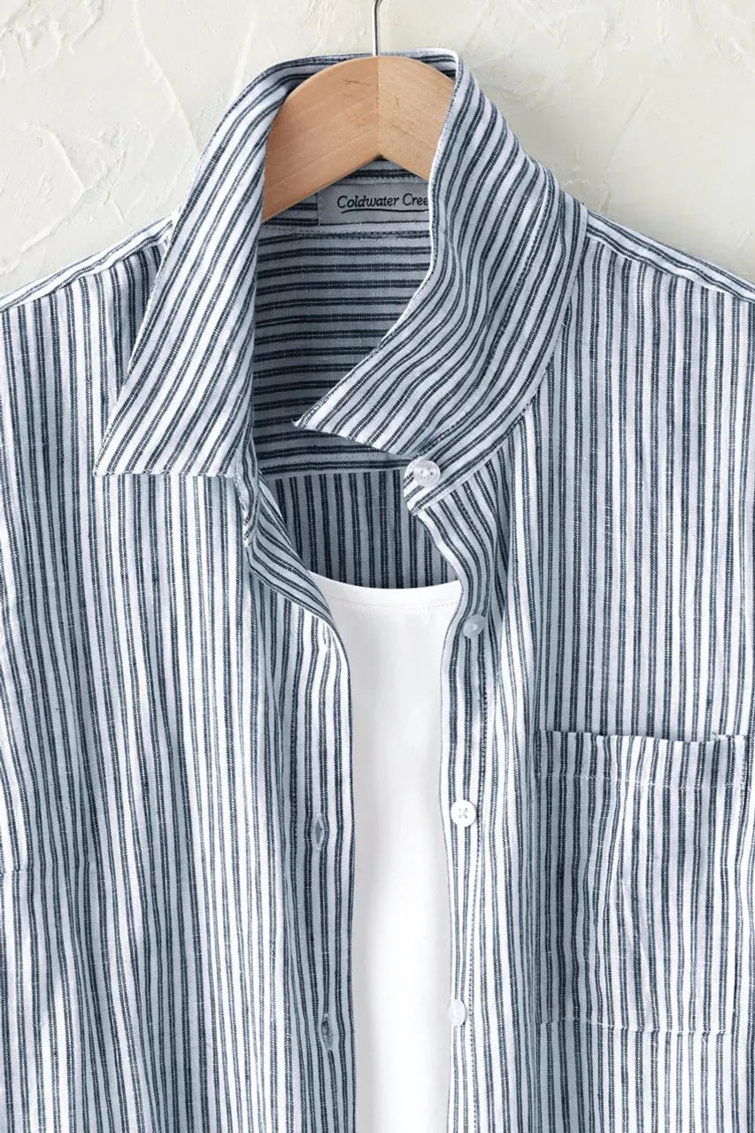 A lightweight go-to piece across seasons, in a slim-striped print – now with a slightly trimmed length for a flattering fit. Great to wear buttoned as a shirt or open as a topper, dressed up or down. Side pockets and one patch pocket, long button-cuff sleeves, shirttail hem.