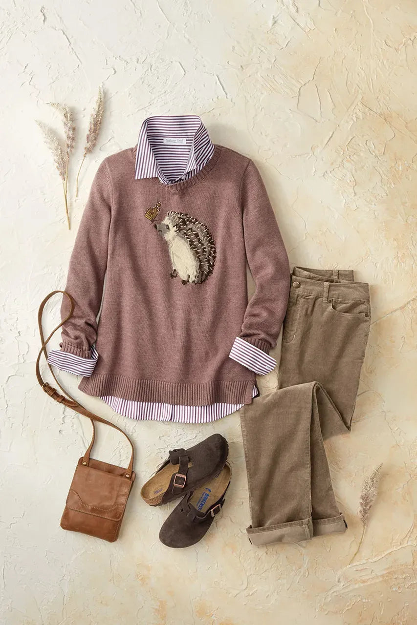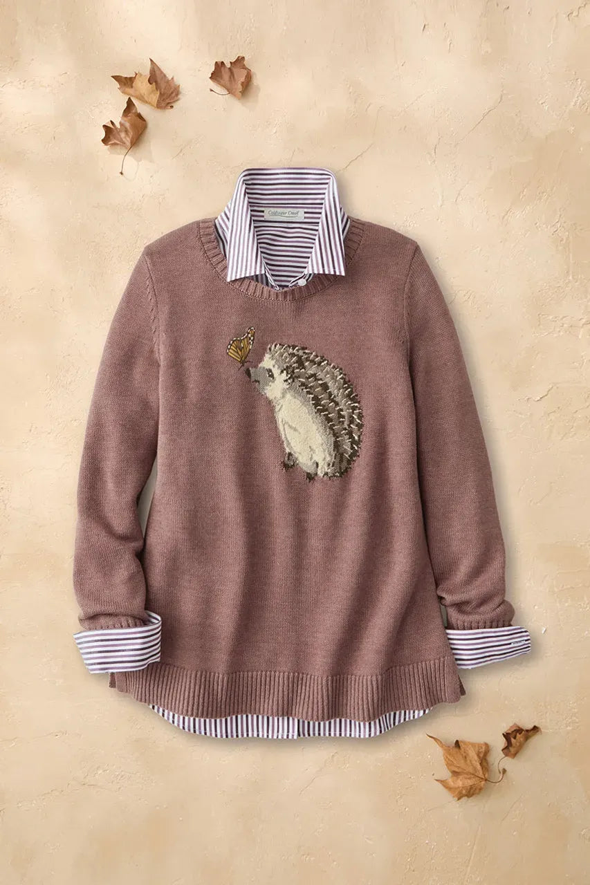 Product Description Our artfully designed pullover sweater highlights a charming hedgehog motif knit with rich textural yarns and friendly butterfly detail. This distinctive midweight heathered knit styles comfortably as a layer over shirts or on its own. Features ribbed trim and side-slit hem for graceful movement. Relaxed fit, hits mid hip.