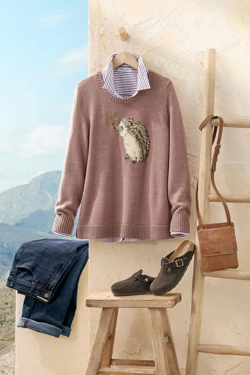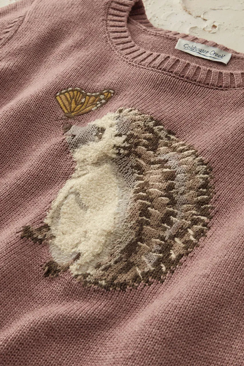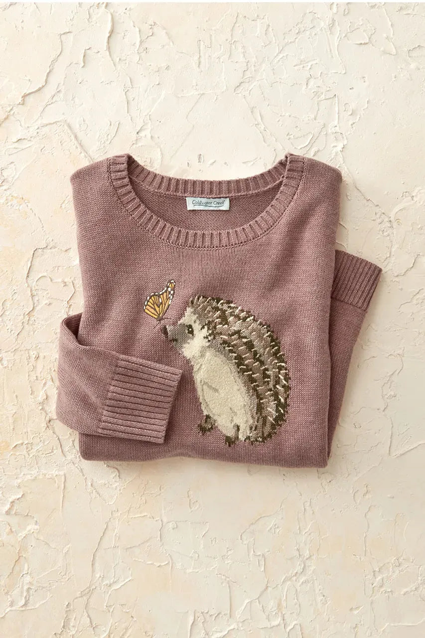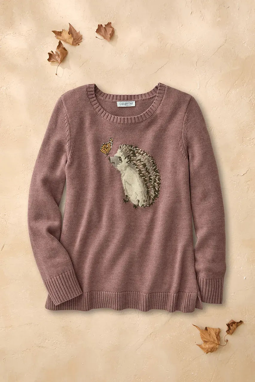 Our artfully designed pullover sweater highlights a charming hedgehog motif knit with rich textural yarns and friendly butterfly detail. This distinctive midweight heathered knit styles comfortably as a layer over shirts or on its own. Features ribbed trim and side-slit hem for graceful movement. Relaxed fit, hits mid hip.