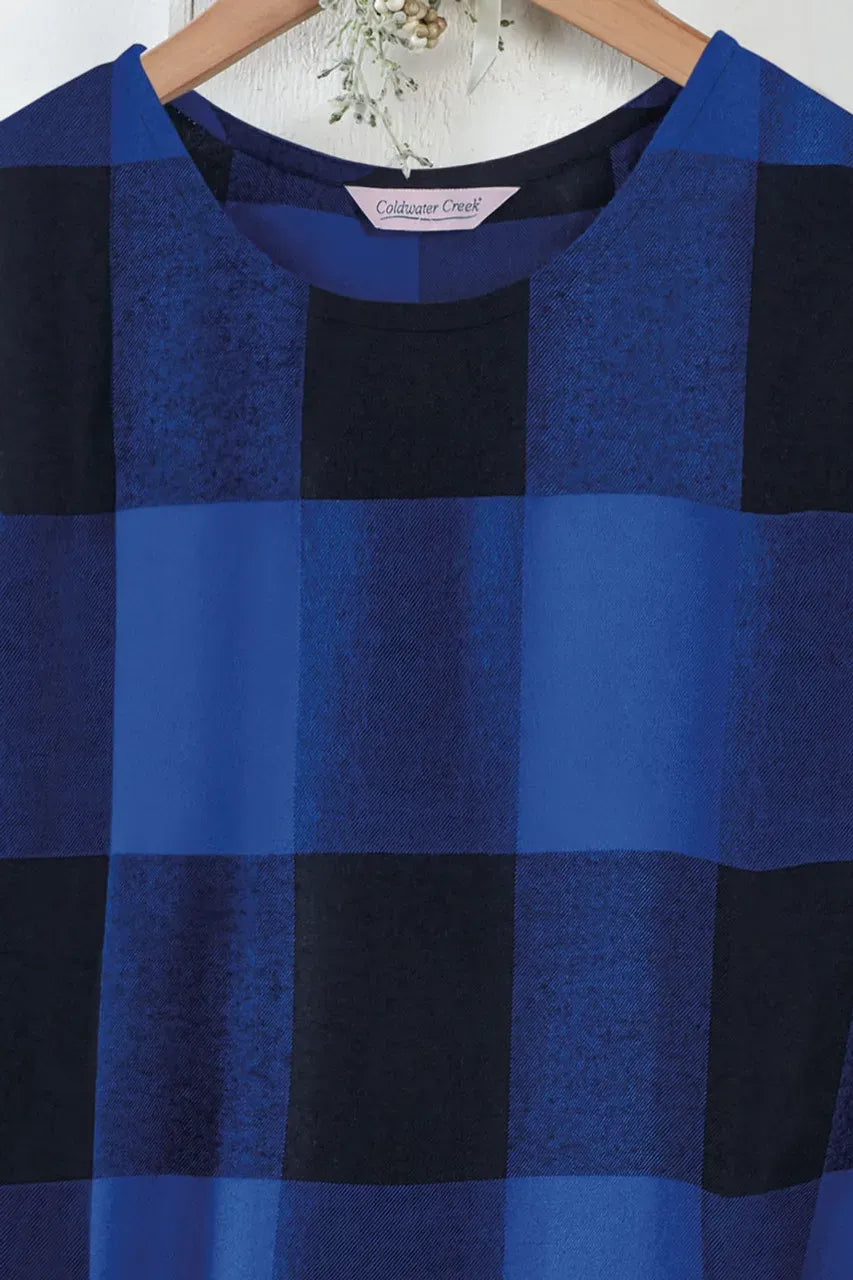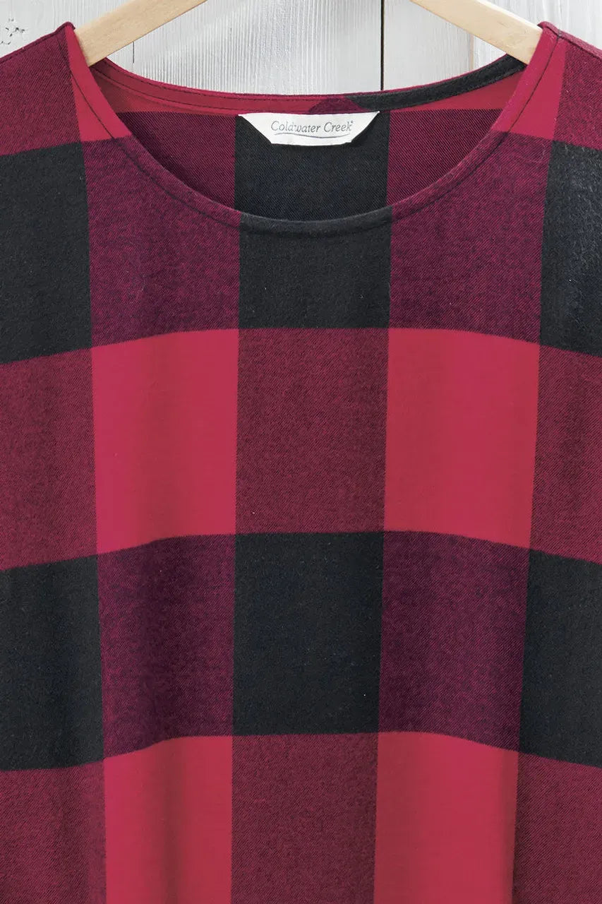 Buffalo checks with an easy flair – so perfect with tights or boots. Soft-brushed challis lends easy drape, with boatneck, slant pockets and bust darts for shape.