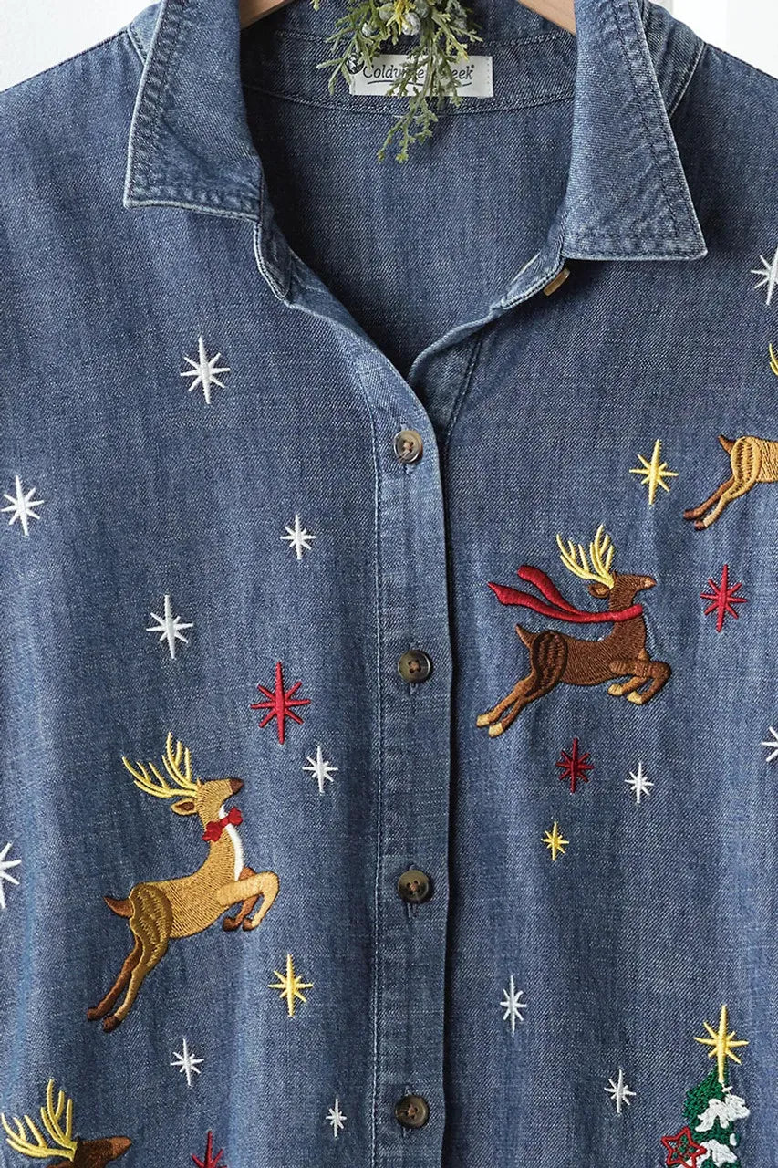 Product Description Holiday spirit that shoots for the stars. Our denim shirt is embroidered with four ready reindeer and a decorated tree, against a starry night sky. Plain back with pleated yoke, high-low hem, long button-cuff sleeves.
