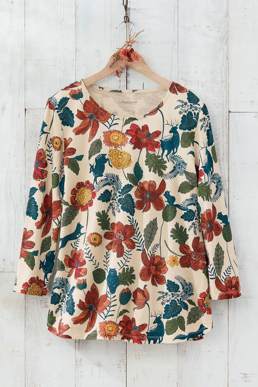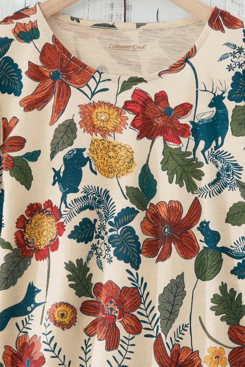 Artist’s-sketch florals and frolicking deer evoke the delight of nature in rich autumn colors. Soft and light slub knit with crewneck.
