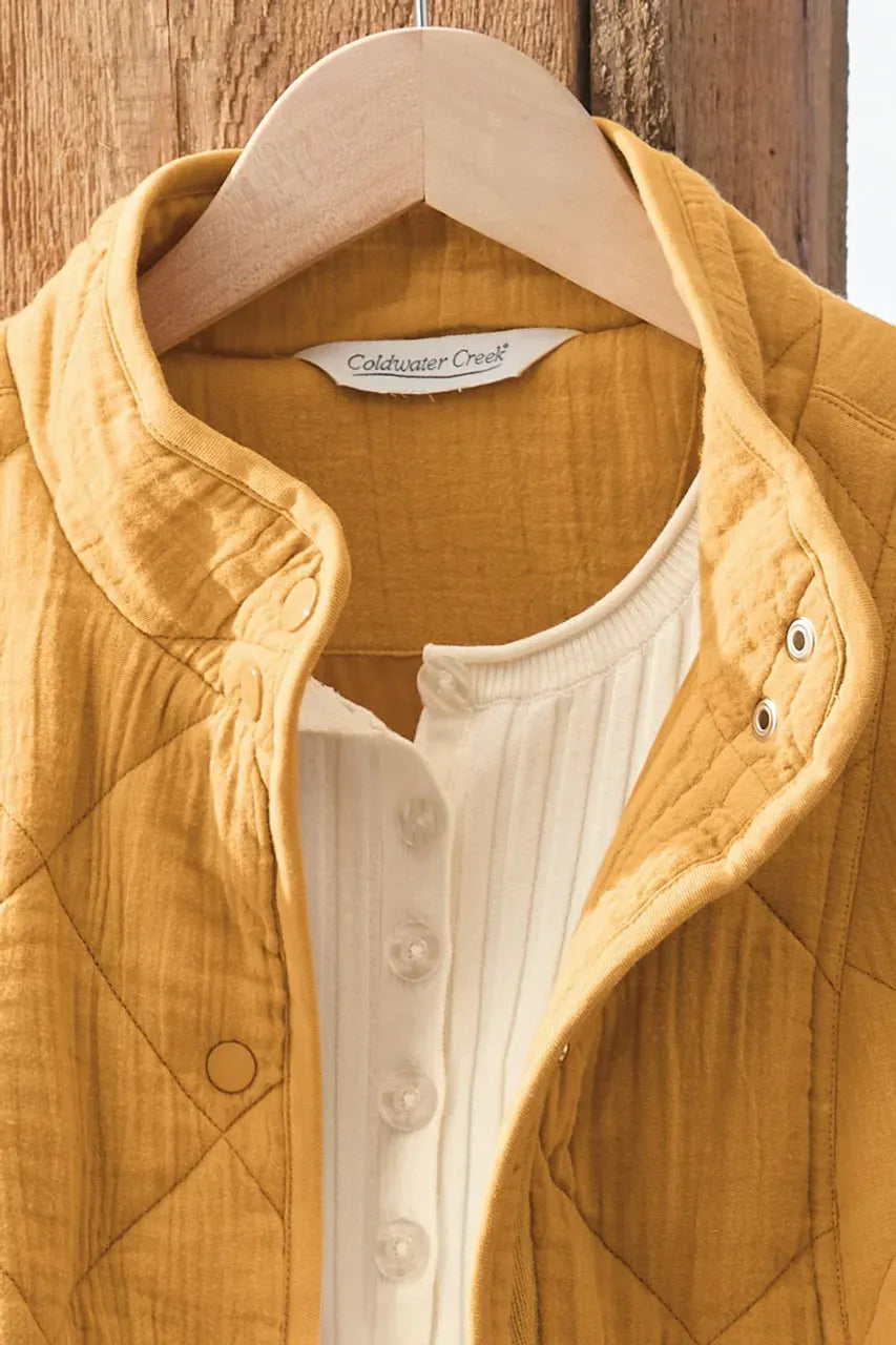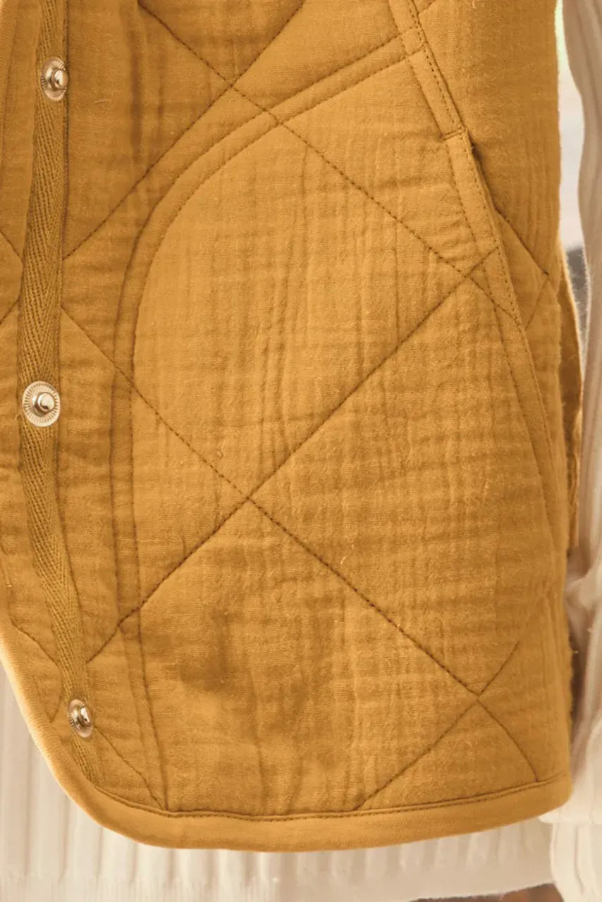 Soft and breathable in cotton gauze, this snap-front vest features diamond quilting and light fill – an ideal transitional layer with a pop of color. Front and back seaming details, side gussets.