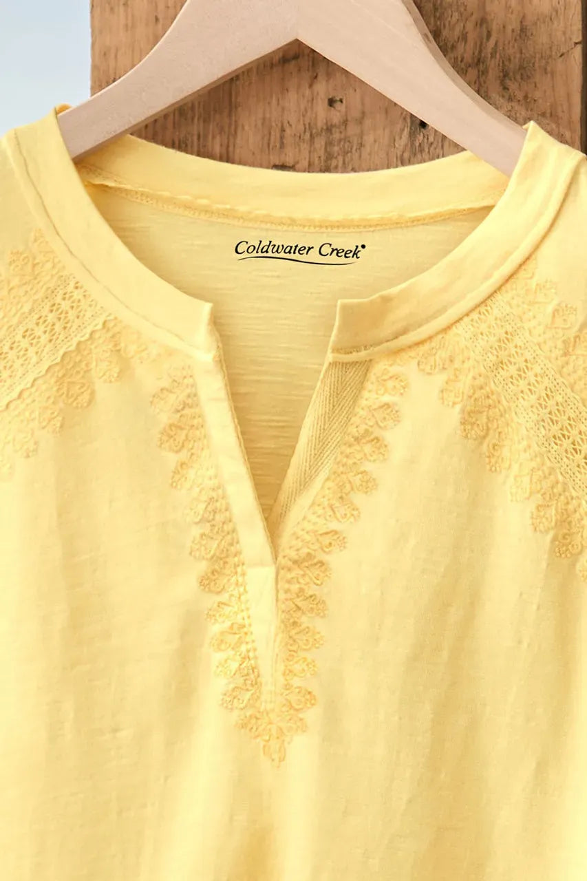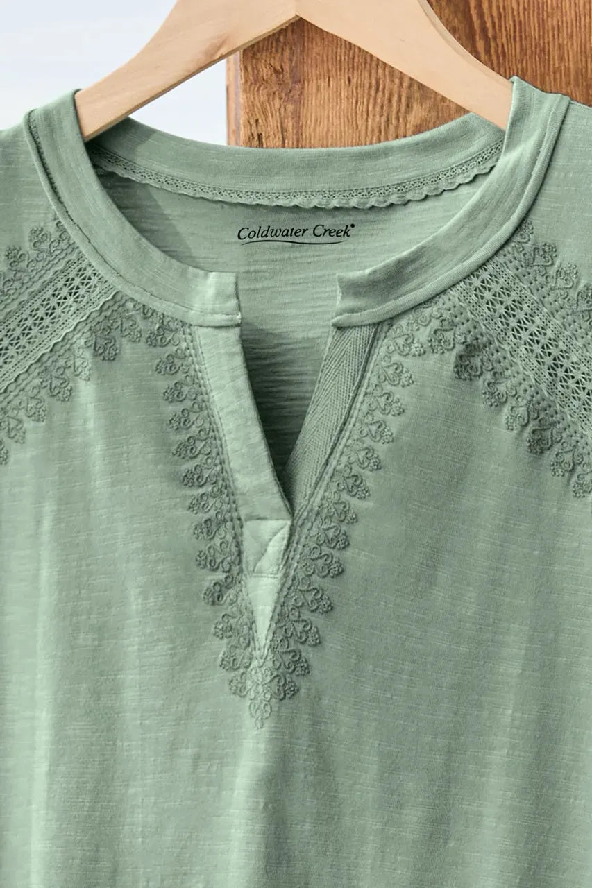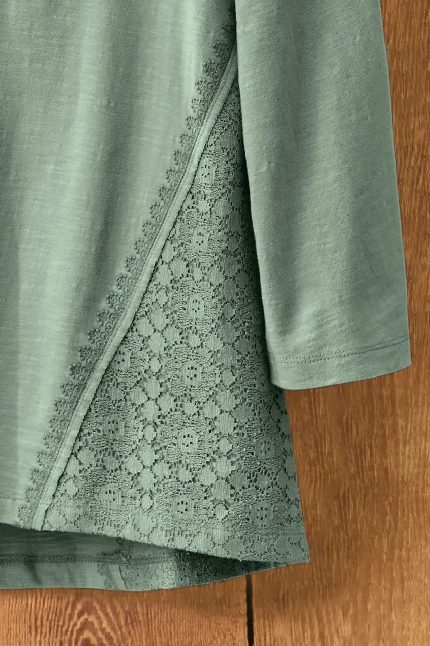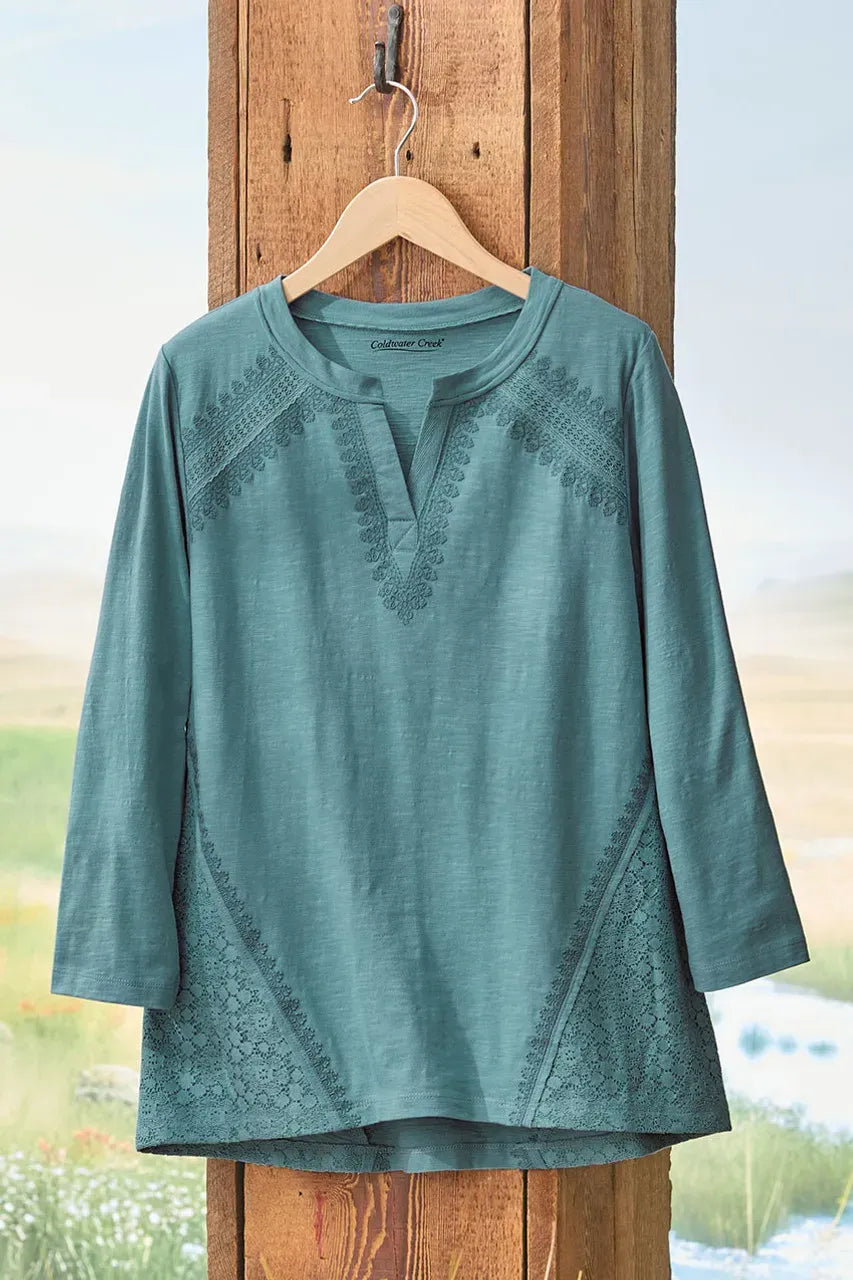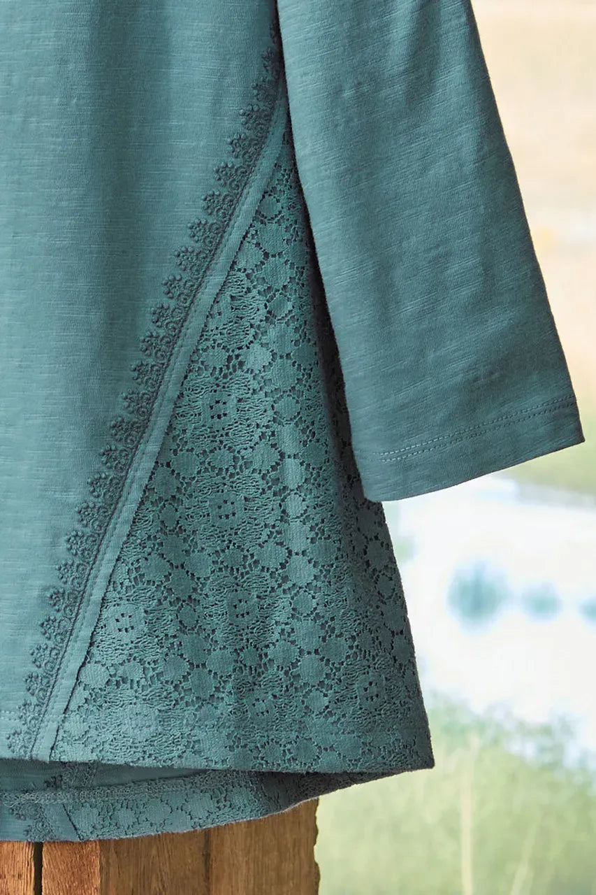 Product Description                        Soft slub knit is complemented by embroidered lace insets and angled seams. Slight A-line shape with split neck, elliptical hem. Lightweight.