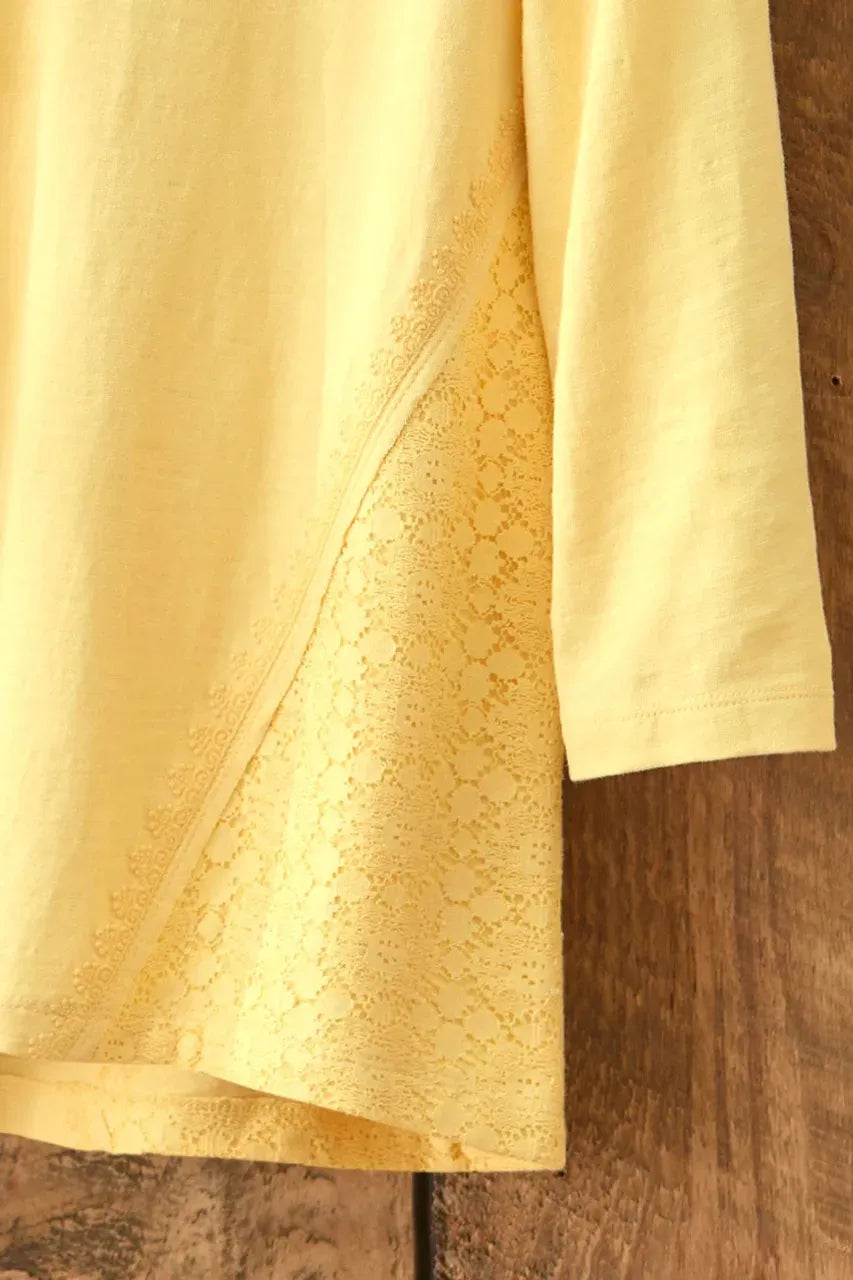 Soft slub knit is complemented by embroidered lace insets and angled seams. Slight A-line shape with split neck, elliptical hem. Lightweight.