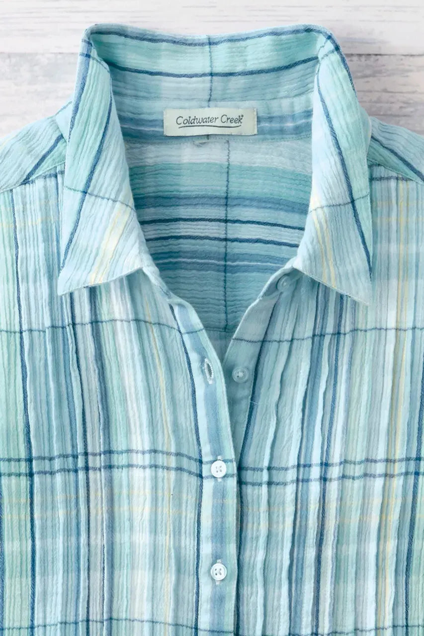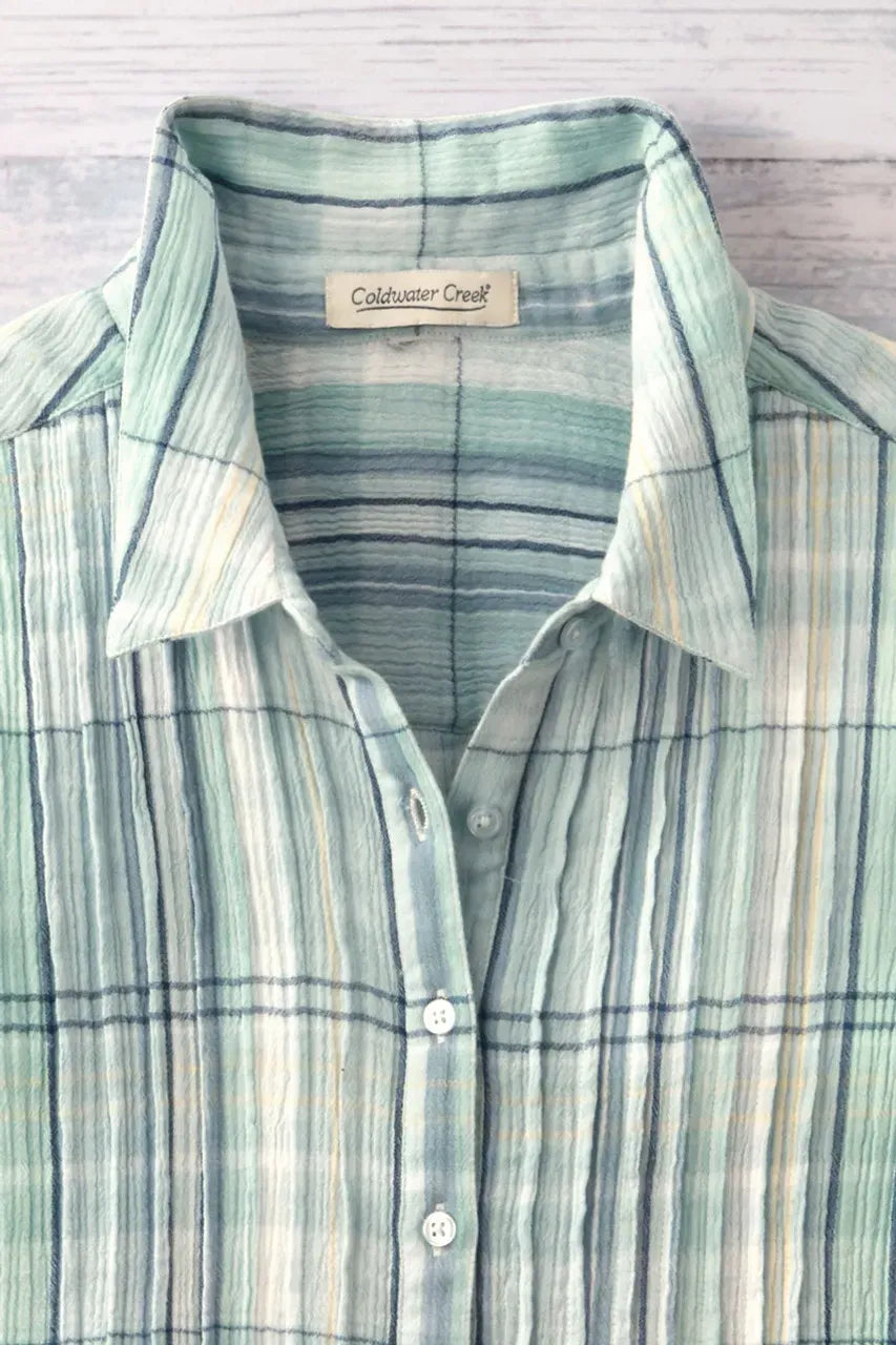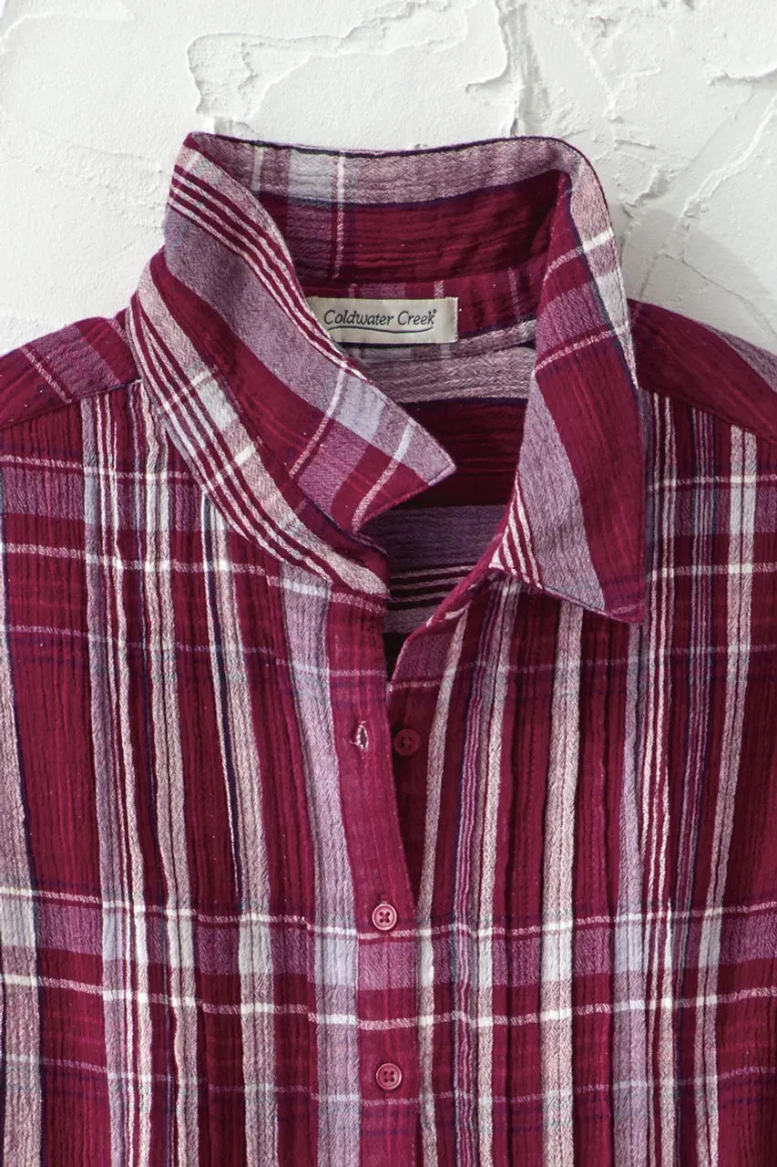 Product Description                        Enjoy some pattern play in our double-faced gauze top – plaid outside and checked inside. Midweight slipover style has buttoned half-placket, pleated back yoke and slight high-low hem with side slits.