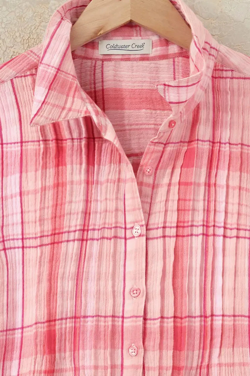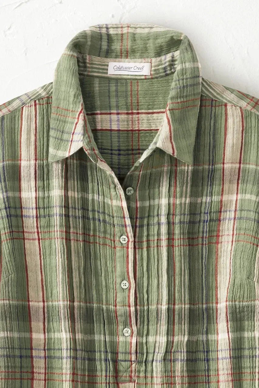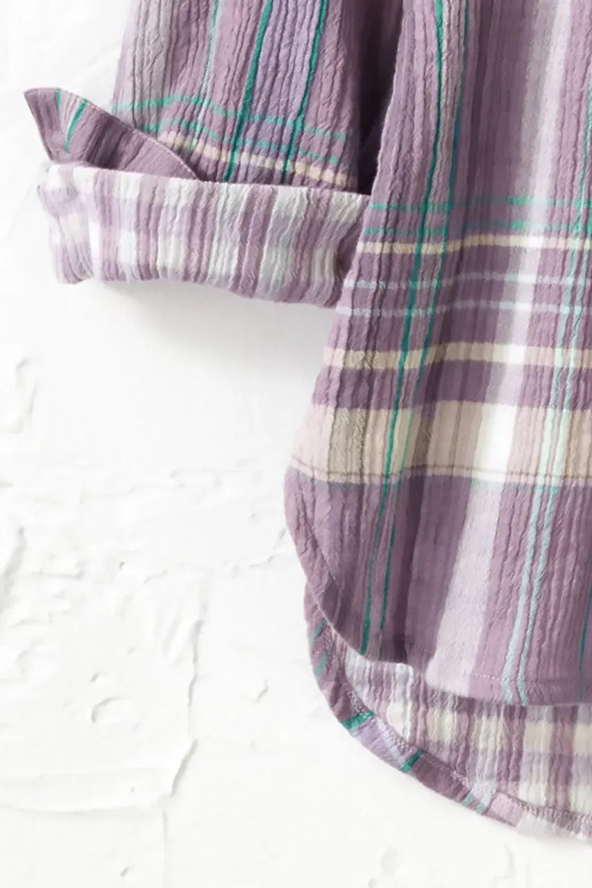 Enjoy some pattern play in our double-faced gauze top – plaid outside and checked inside. Midweight slipover style has buttoned half-placket, pleated back yoke and slight high-low hem with side slits.