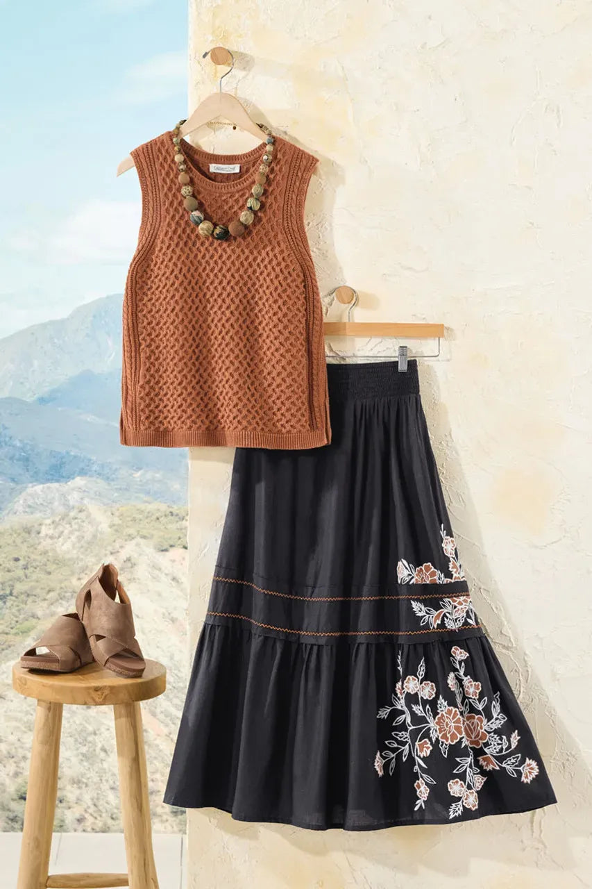 This airy cambric skirt delights in its lightness… and its embellishments. Richly detailed with a comfortable smocked waist, sun-touched embroidery and a tiered hem for added fullness.