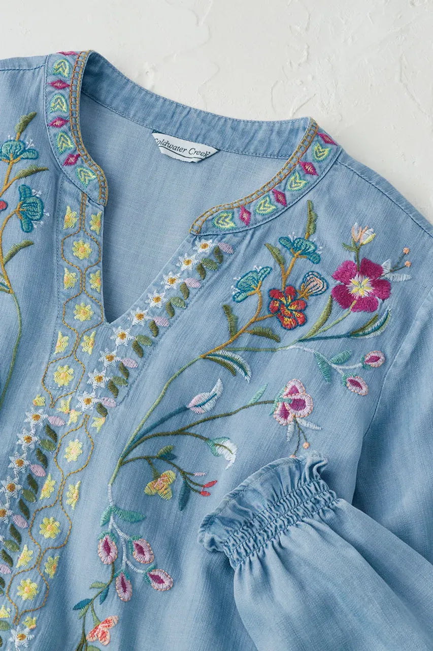 Product Description Like a summer garden on a blue-sky day. Brightly embroidered roses climb up the front of this artisan-style blouse – a beautiful transition piece, now and across seasons. Light and drapey, with smocked-cuff 3/4 sleeves and a side-slit hem. Imported.