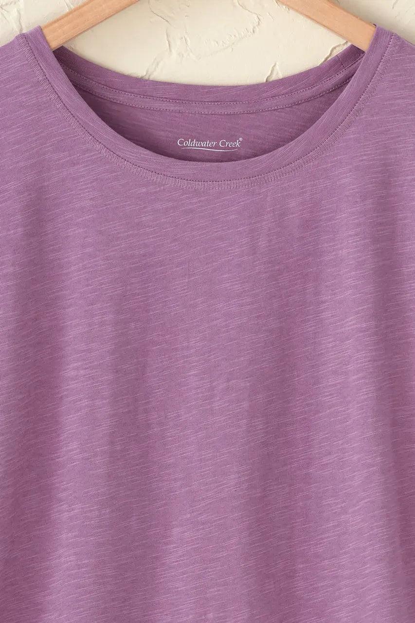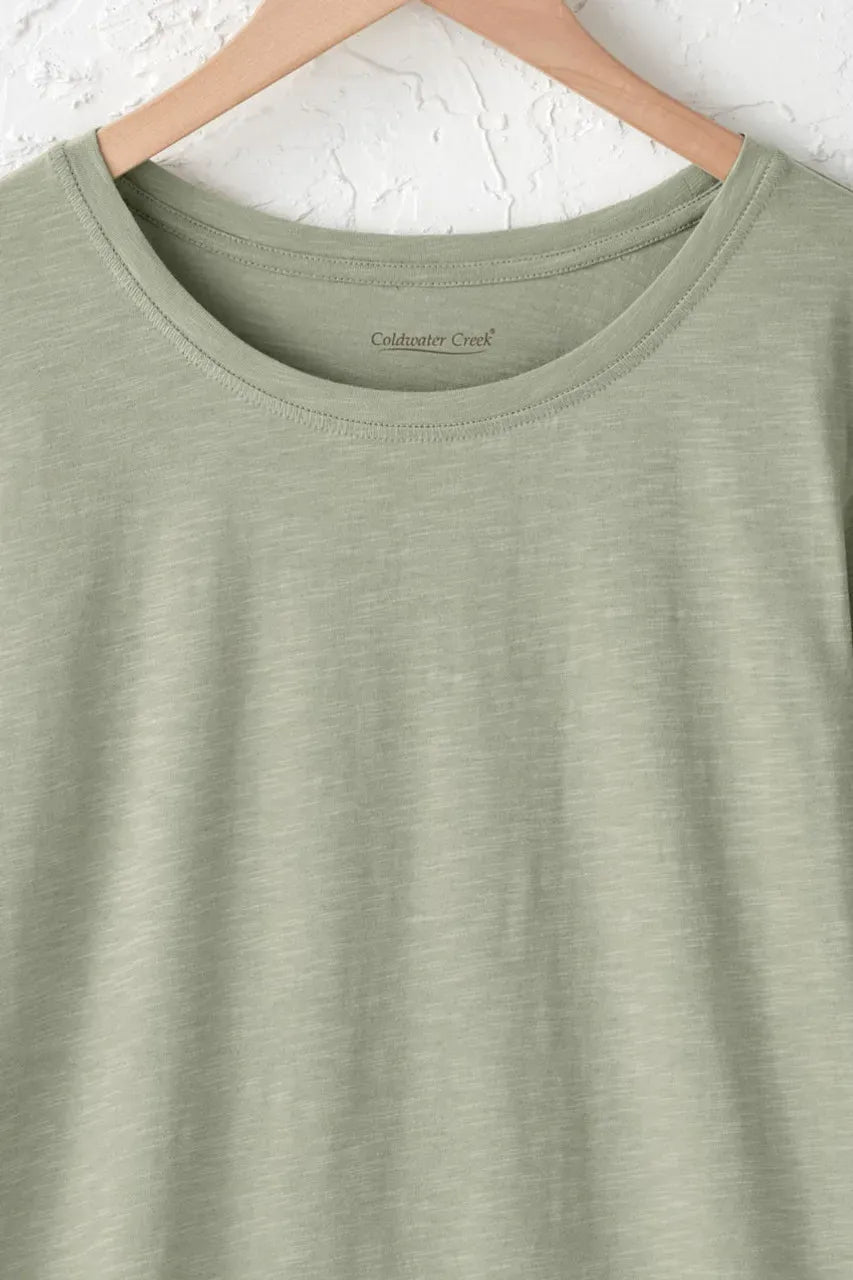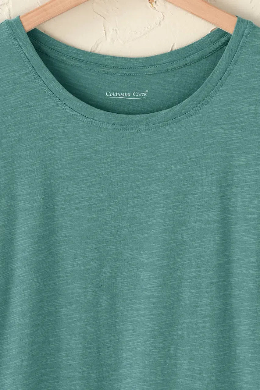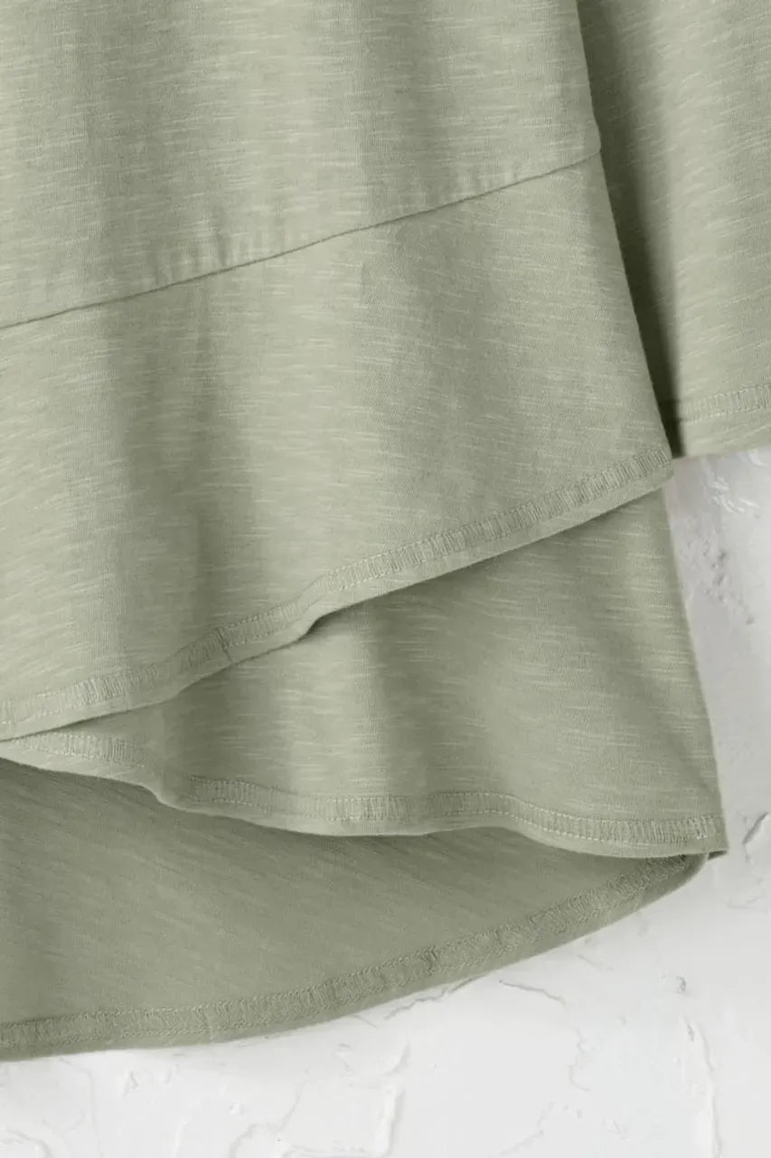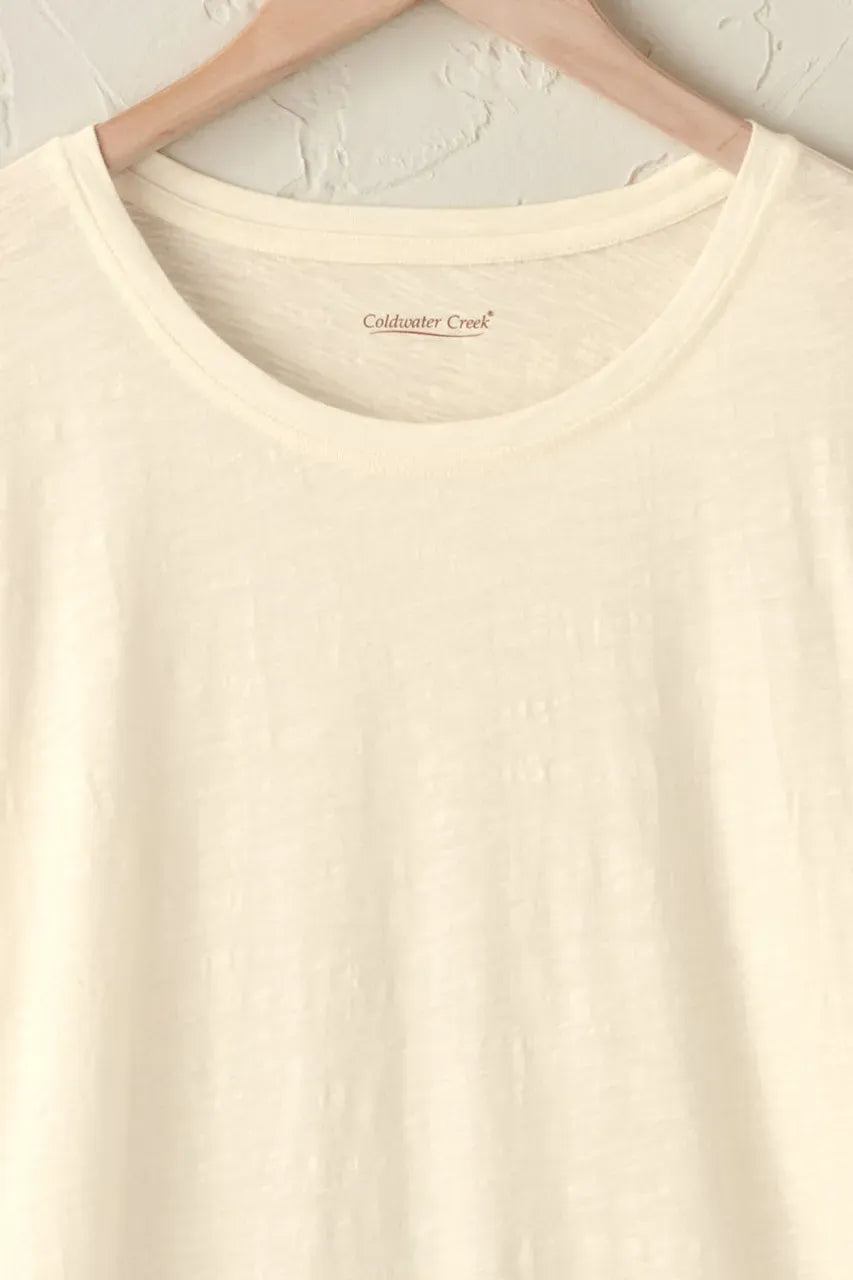 Our soft cotton slub, with an extra-special touch. A flounced crossover hem and slightly lighter weight make this tee perfect for spring-into-summer.
