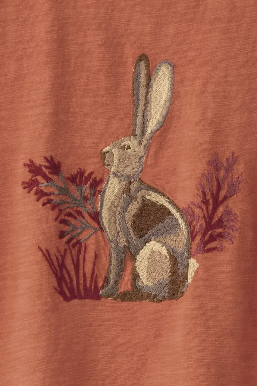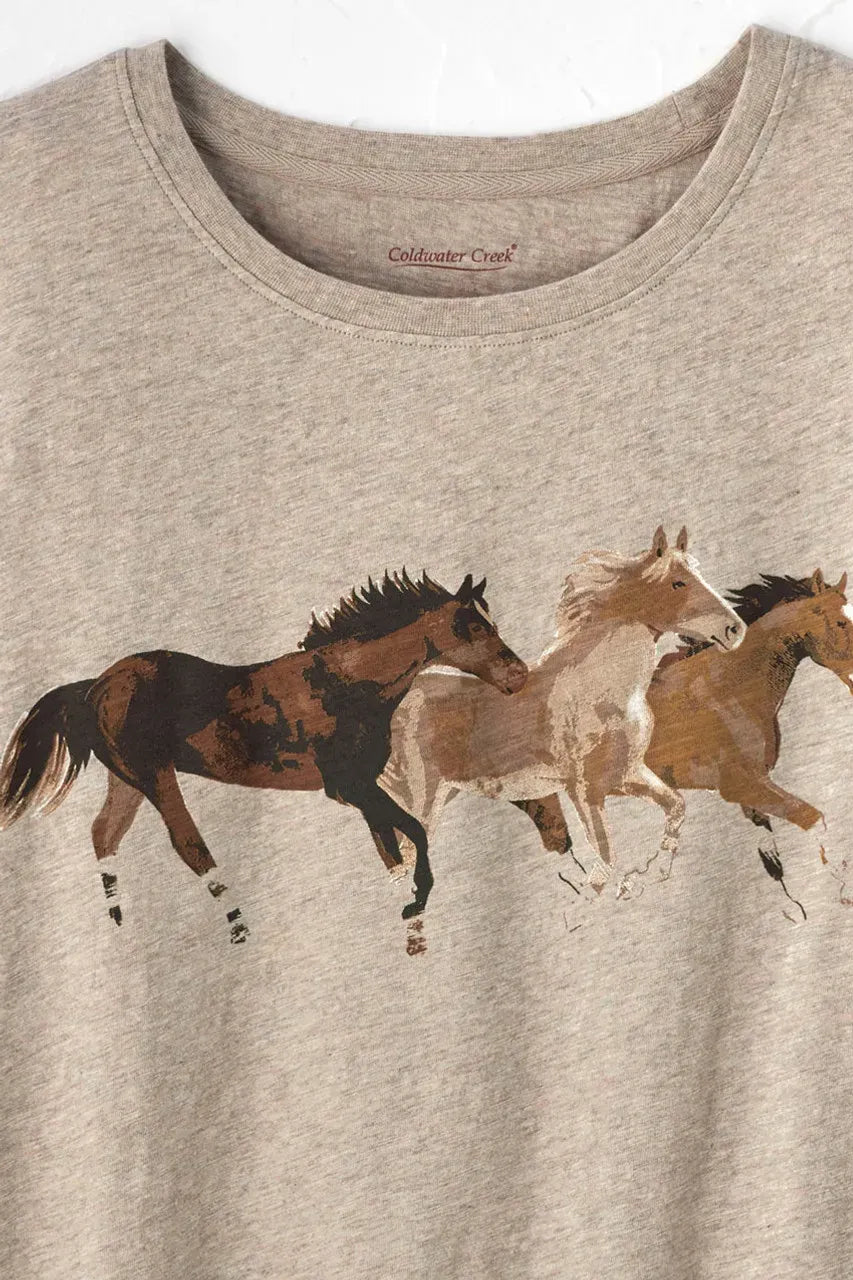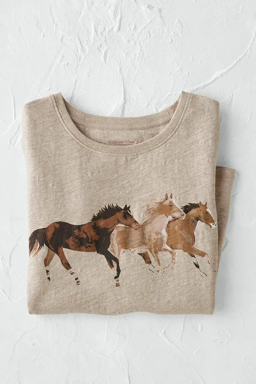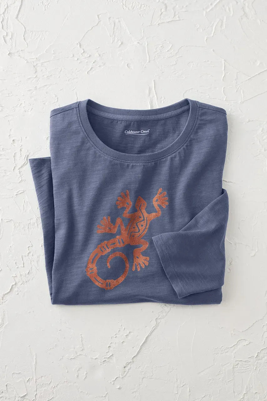 Product Description Graphic tees inspired by the desert Southwest offer comfortable style with artistic flair. Choose from wild horse or gecko prints, or an embroidered desert jackrabbit – all featured on our soft slub knit fabric. Features 3/4 sleeves and side-slit curved hem for a flattering look. Relaxed fit, hits mid hip.