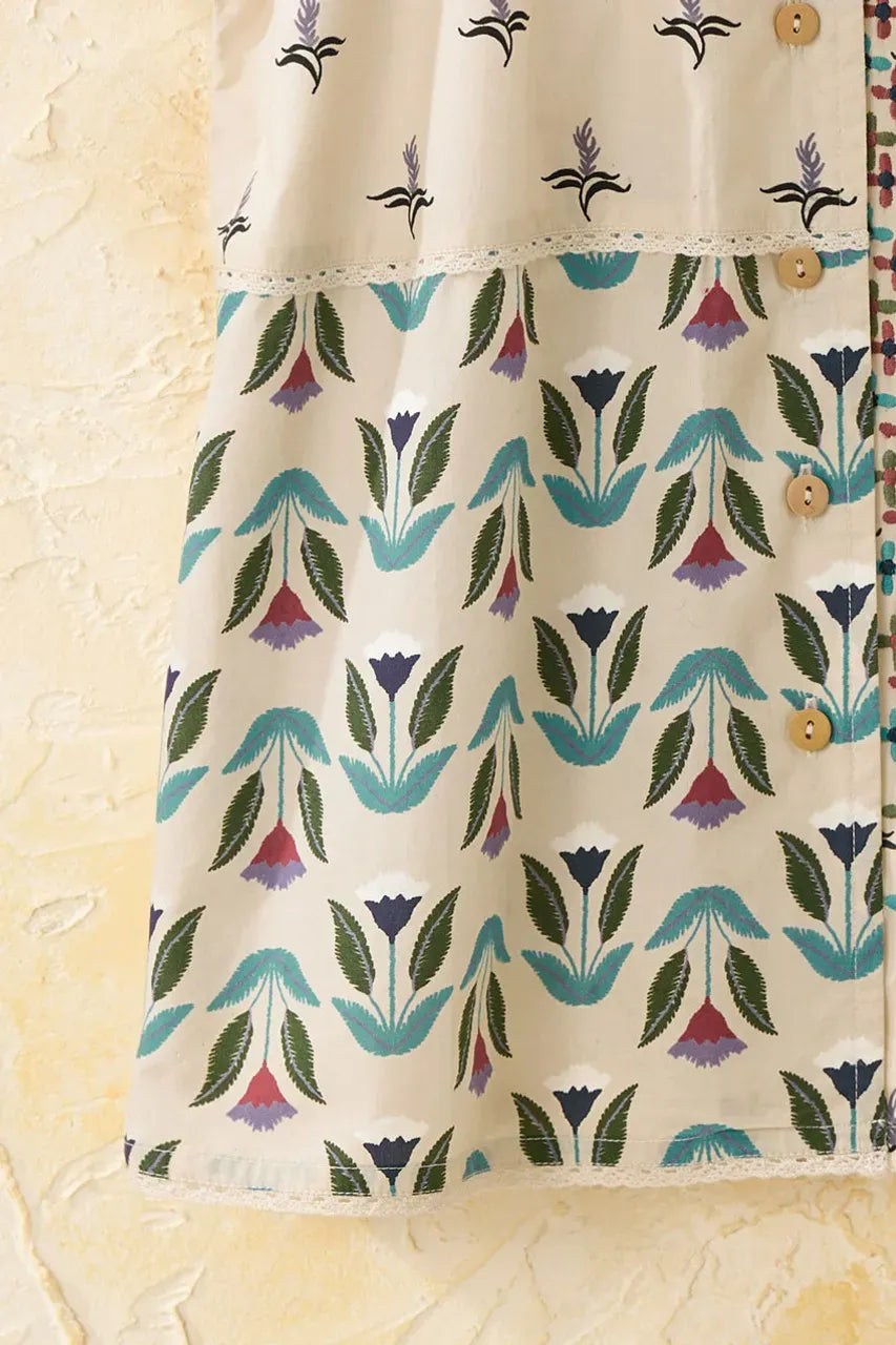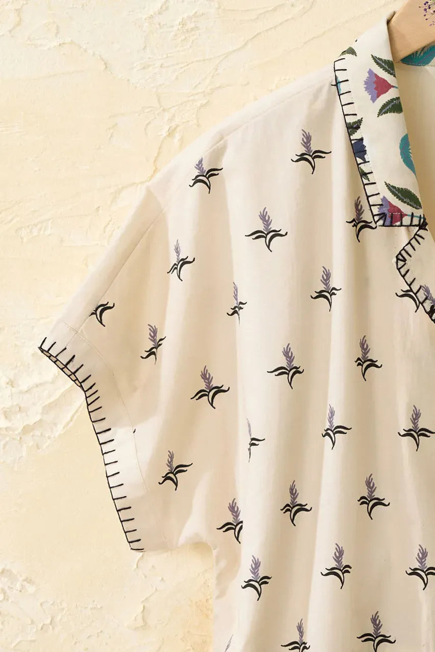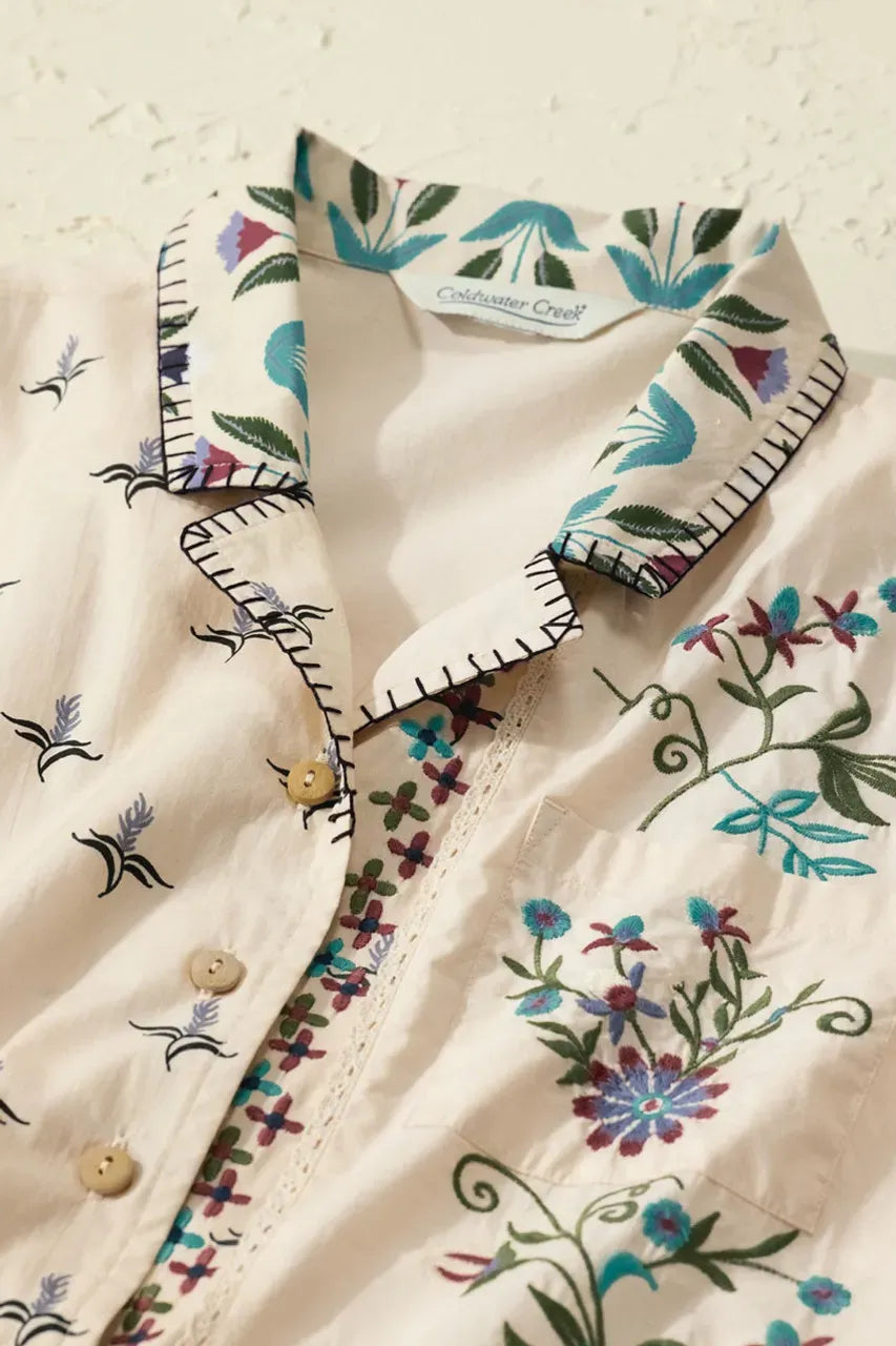 Our lightweight, button-front cambric top mixes unique block prints with flourishes of embroidery – and short dolman sleeves for a roomy, airy feel. Solid white back, straight side-slit hem.