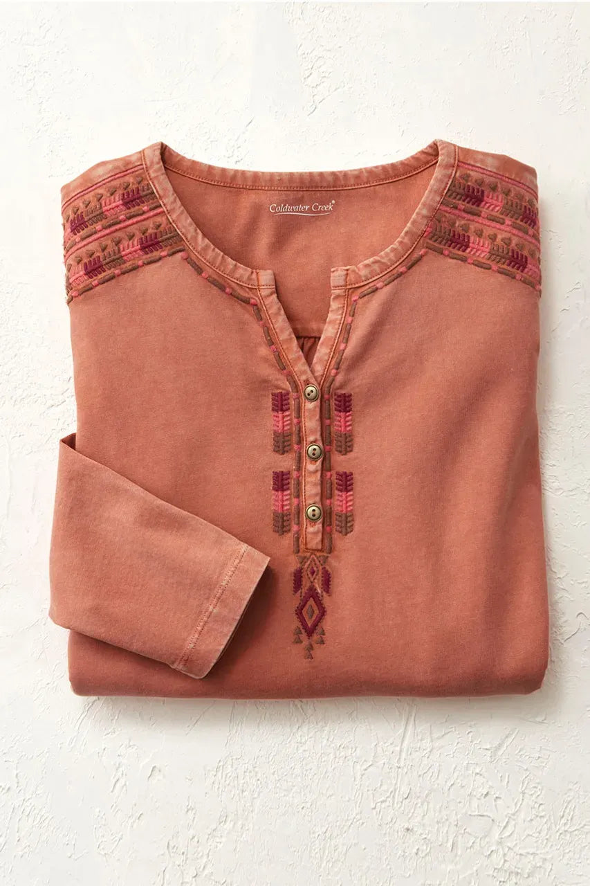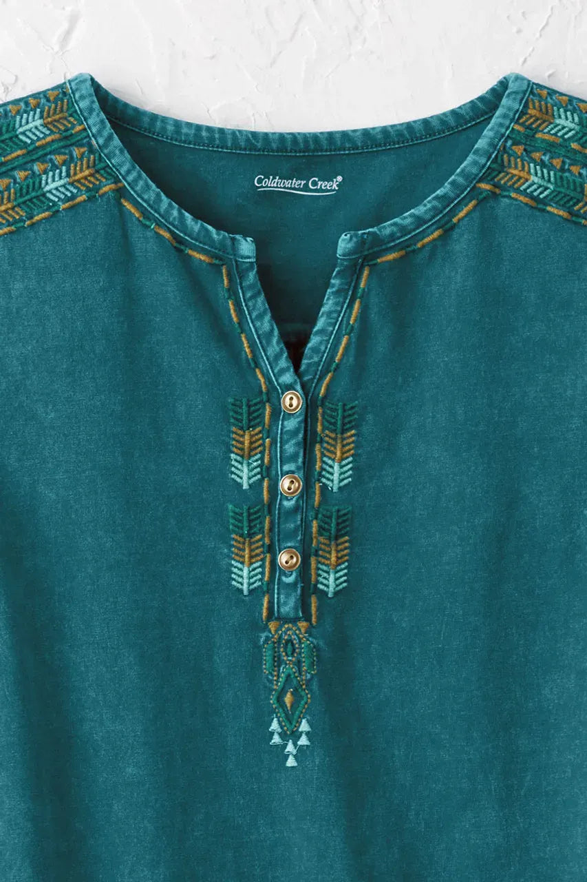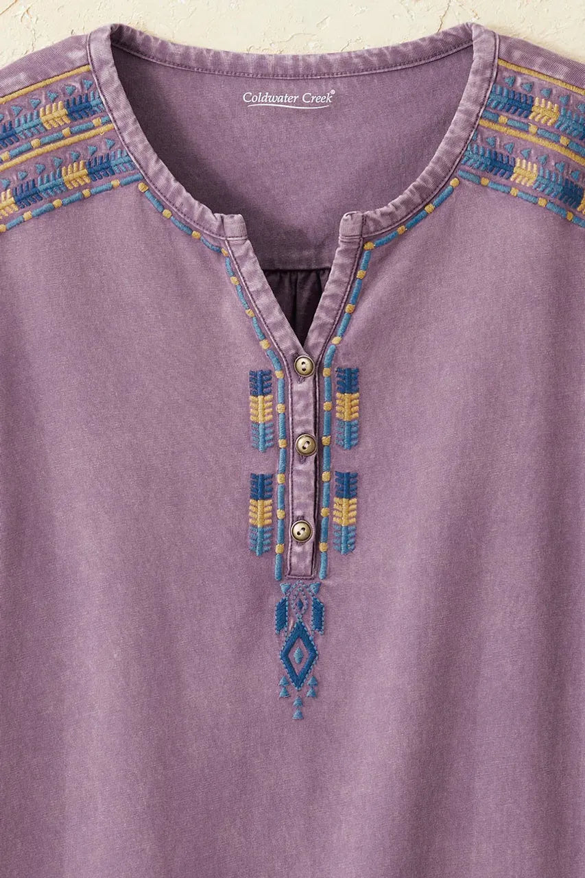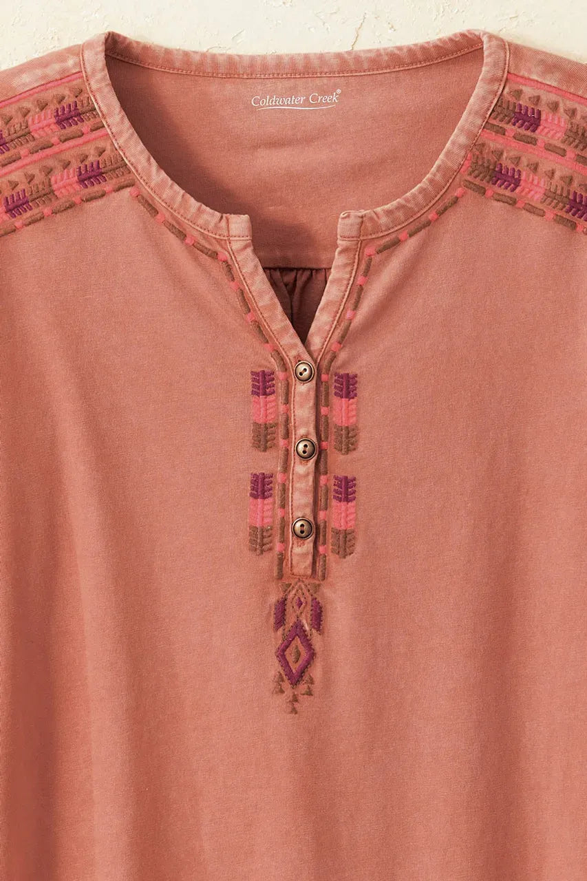 Our lightweight jersey top, embellished with colorful Southwestern-inspired embroidery at the shoulders and placket. Vintage-washed for softness and a lived-in look. Curved hem.