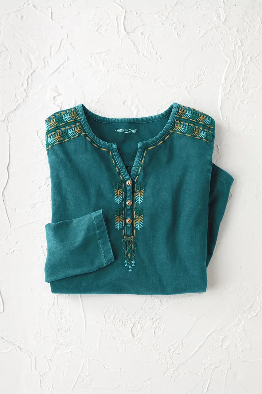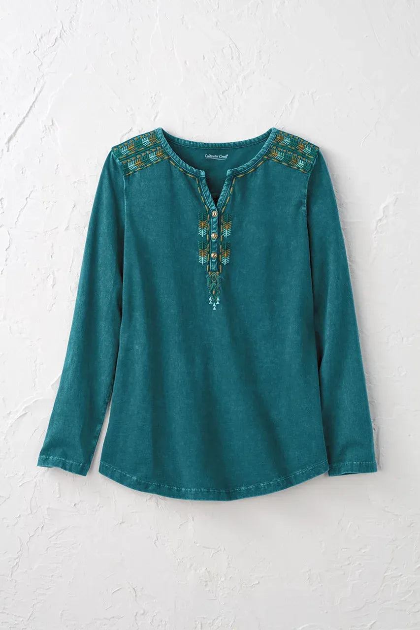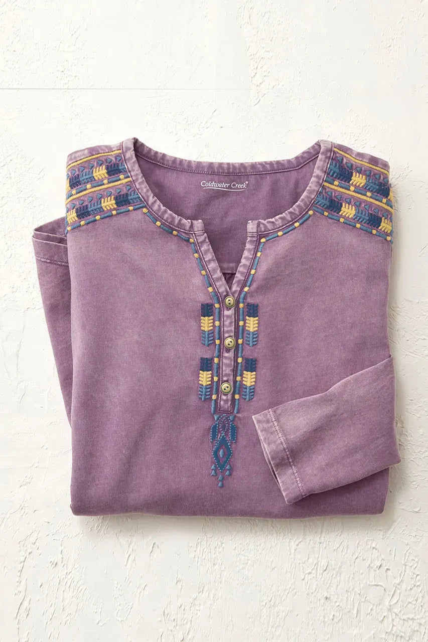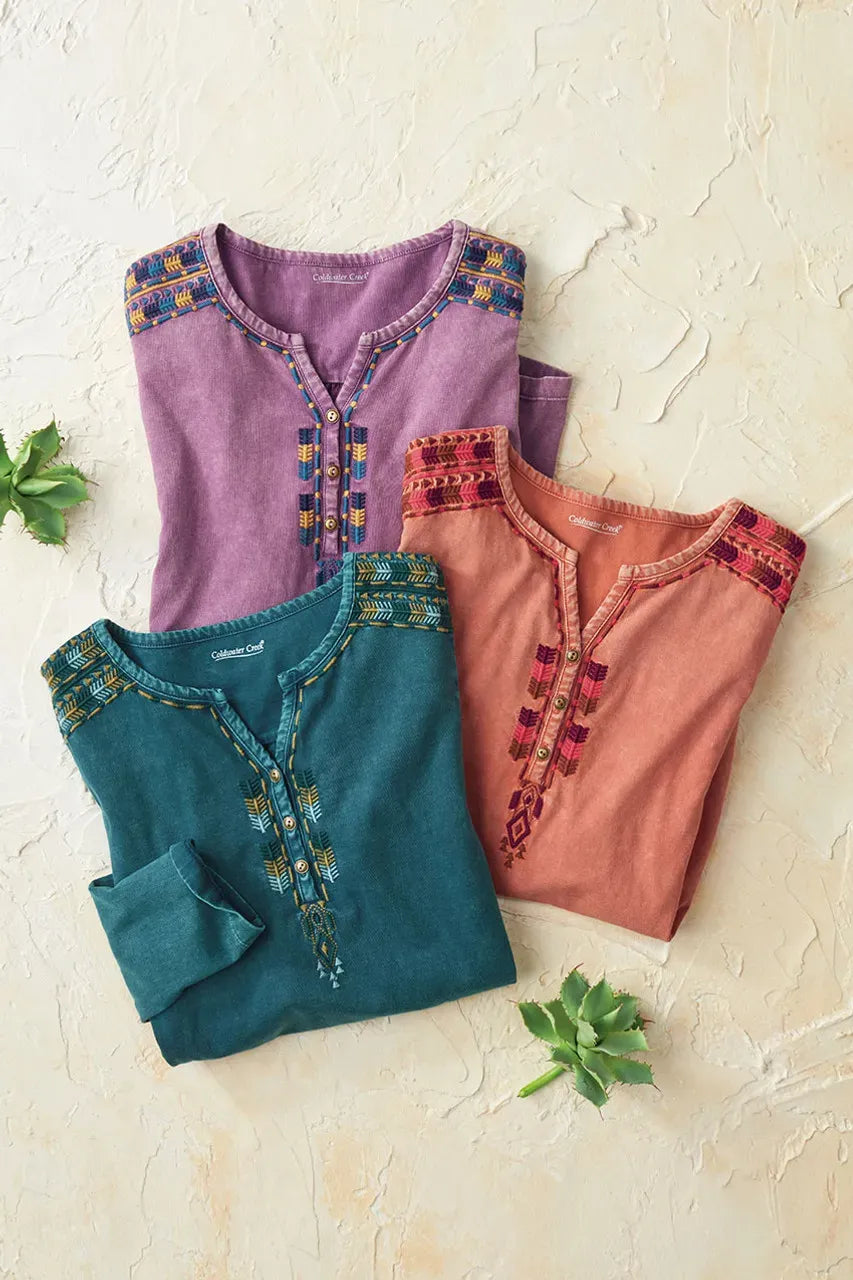Our lightweight jersey top, embellished with colorful Southwestern-inspired embroidery at the shoulders and placket. Vintage-washed for softness and a lived-in look. Curved hem.