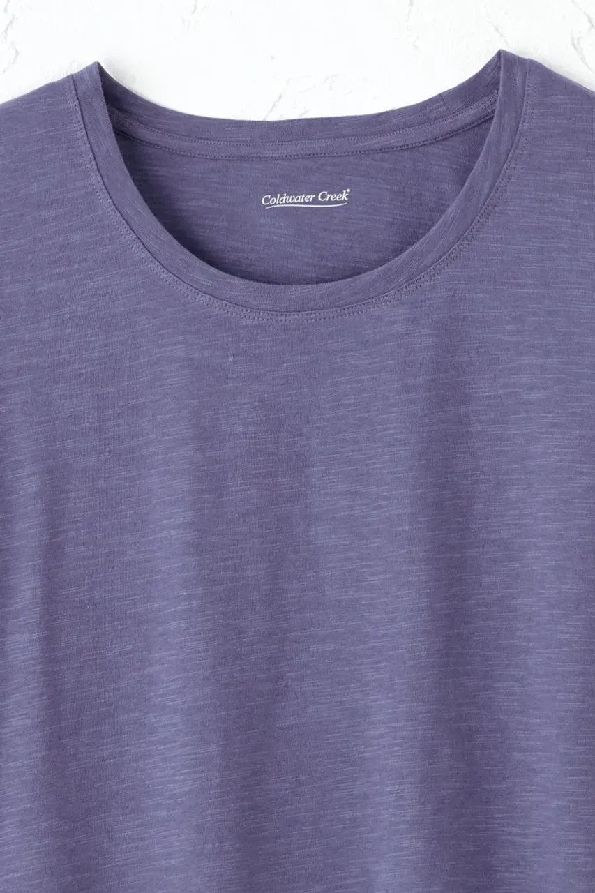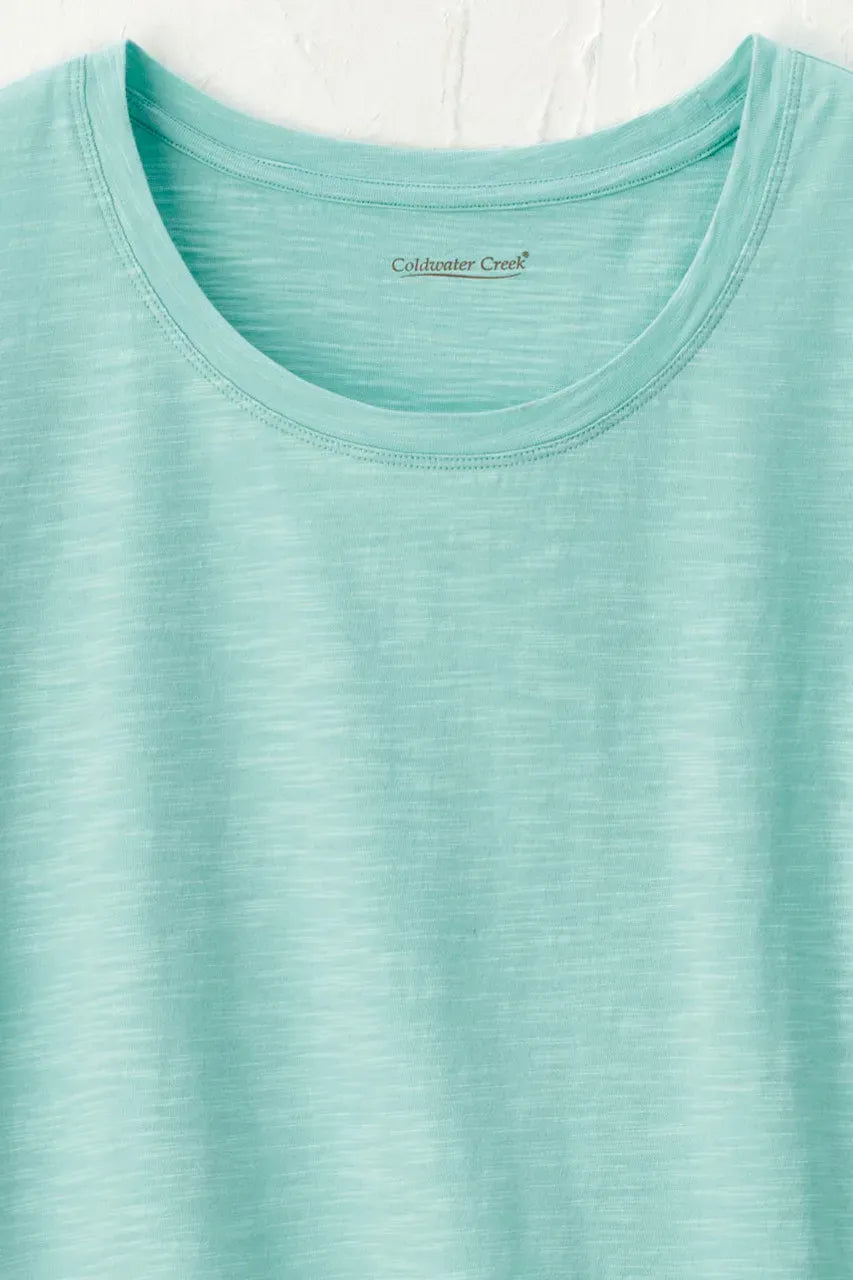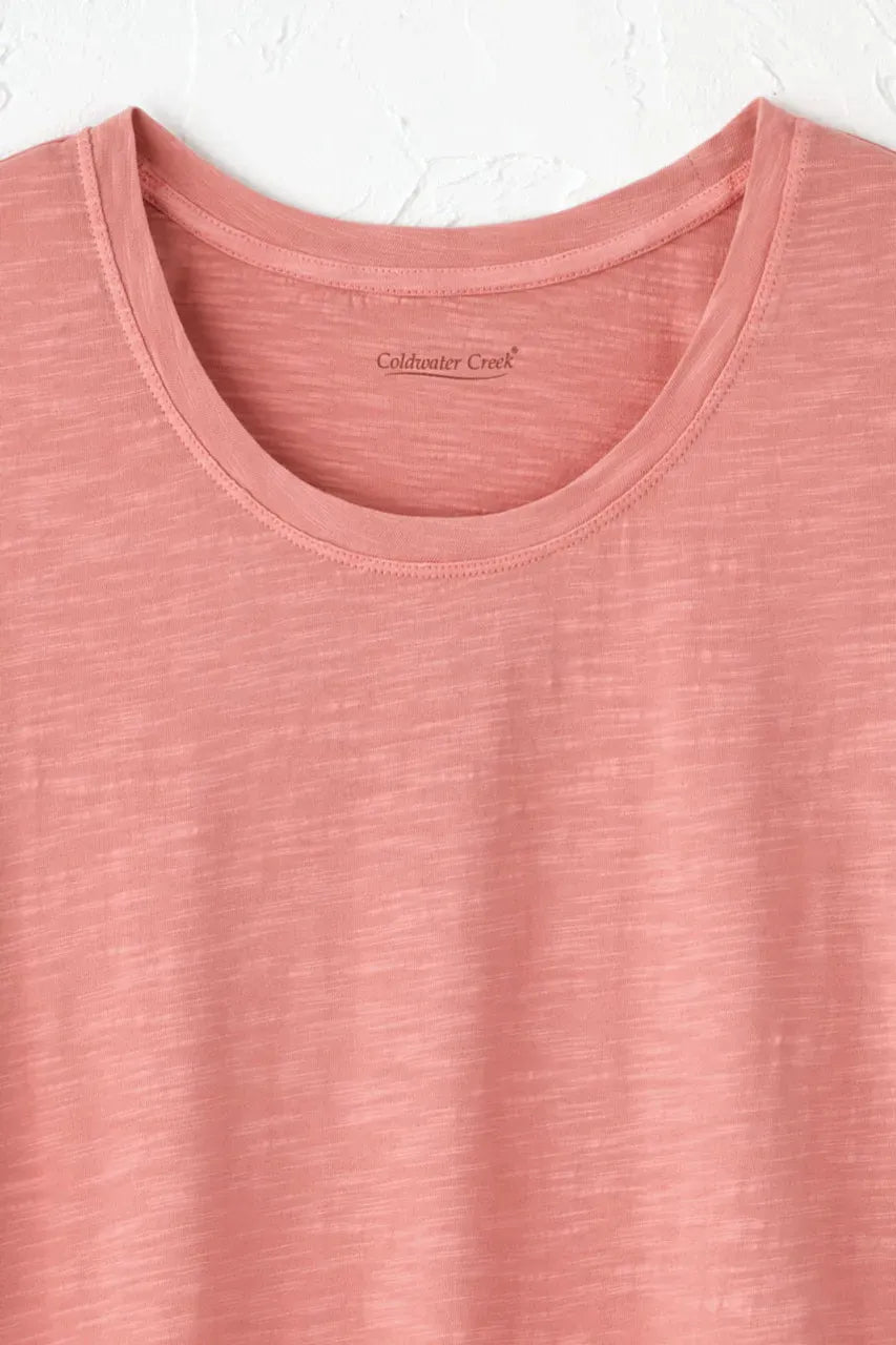 Three cheers for the weekend – or any day. This light, slub knit tee adds a special touch with a raw-edge pieced hem and a slight high-low hem. Slight A-line silhouette.