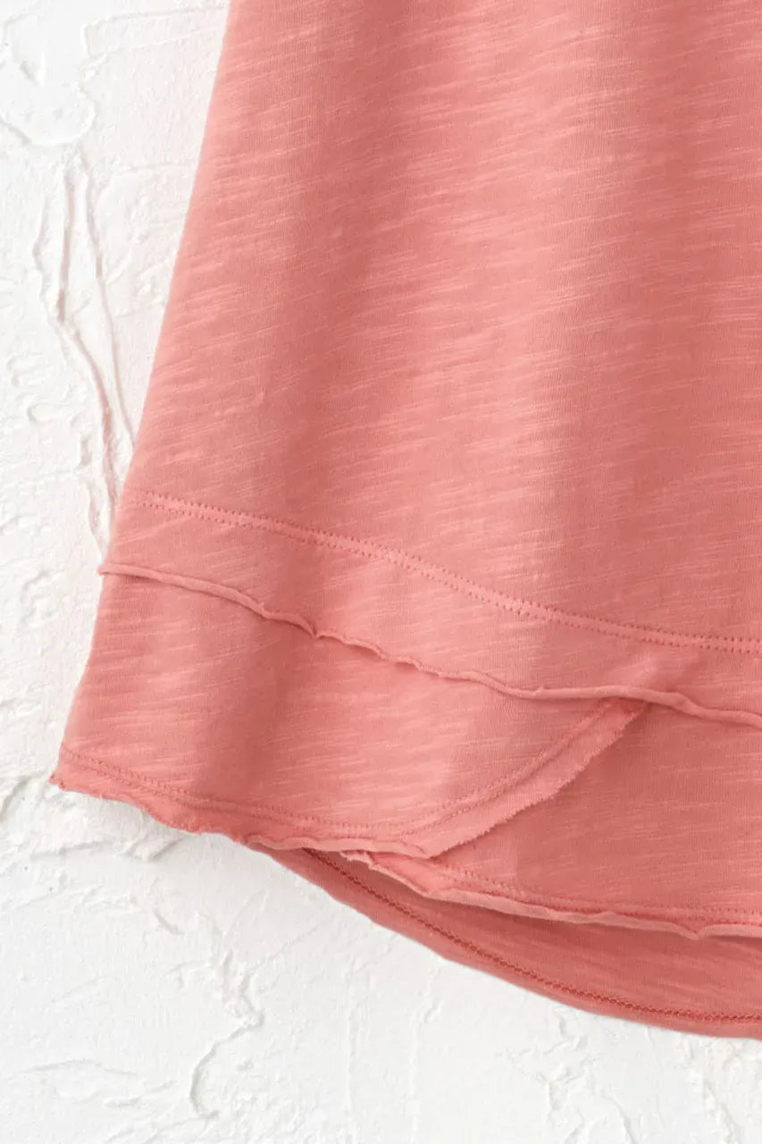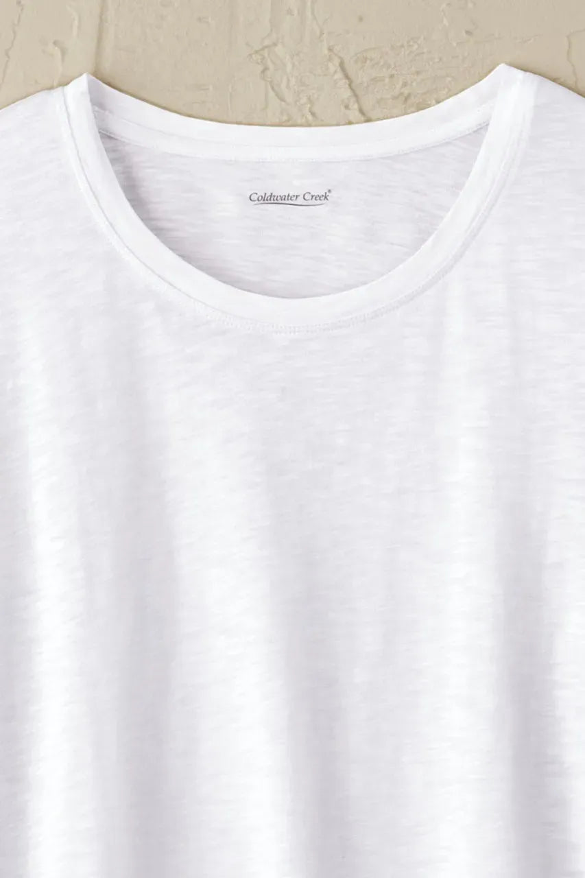 Product Description Three cheers for the weekend – or any day. This light, slub knit tee adds a special touch with a raw-edge pieced hem and a slight high-low hem. Slight A-line silhouette.
