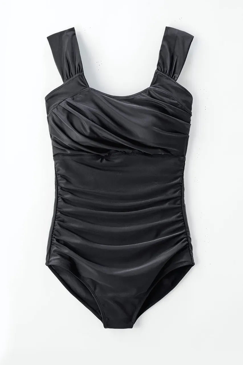 Product Description Our one-piece suit with an updated fit – ruched at the waist, bust and straps, while our inner power mesh ShapeMe panel smooths and shapes inside. Soft, wide straps provide an exceptionally comfortable, flattering fit. Silicone grip dots keep the leg openings in place. Shelf bra with fixed cups, straight back. UPF 30 for UV protection, chlorine resistant.