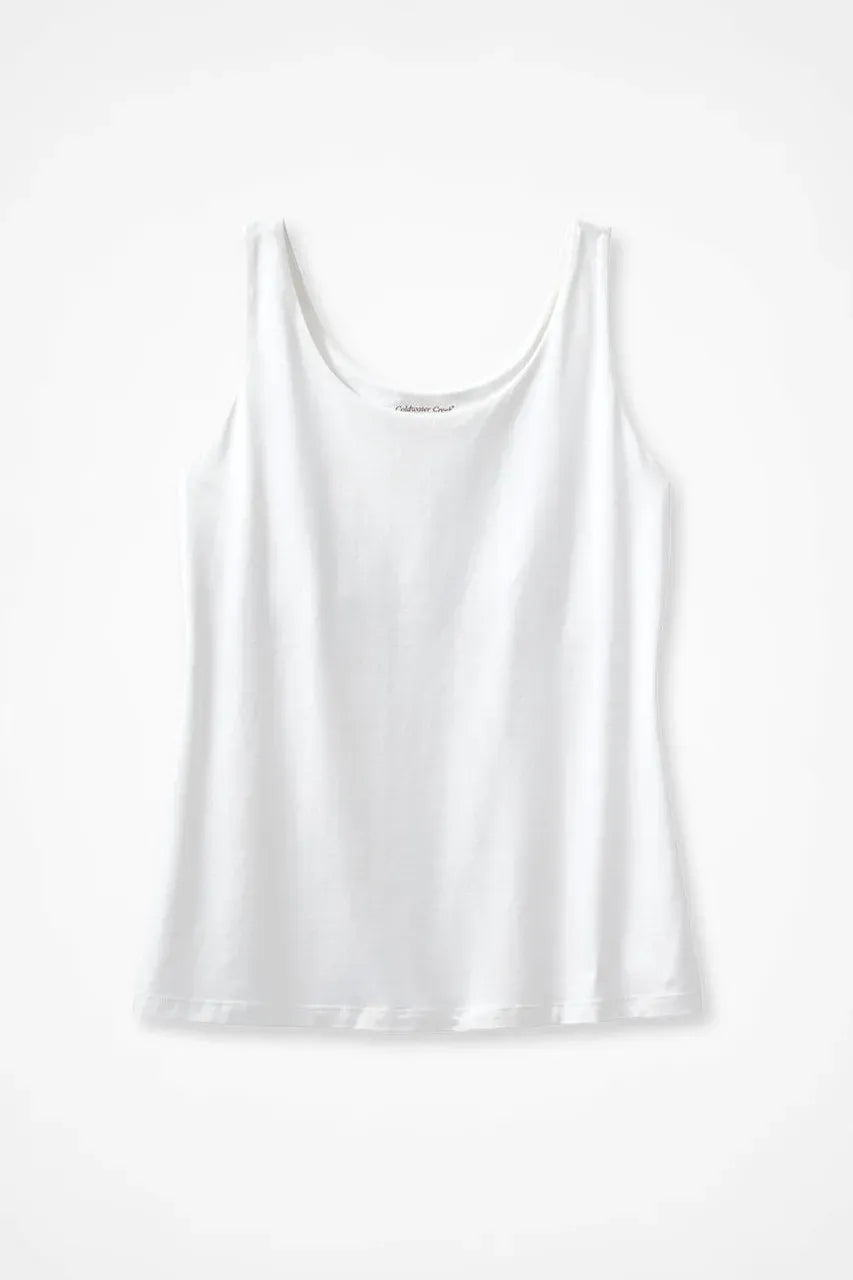 An essential layering piece, in soft knit jersey with a touch of stretch. Shaped, gathered shelf bra has strong yet comfortable underbust elastic. Longer length provides full coverage. Tagless scoopneck, straight hem.