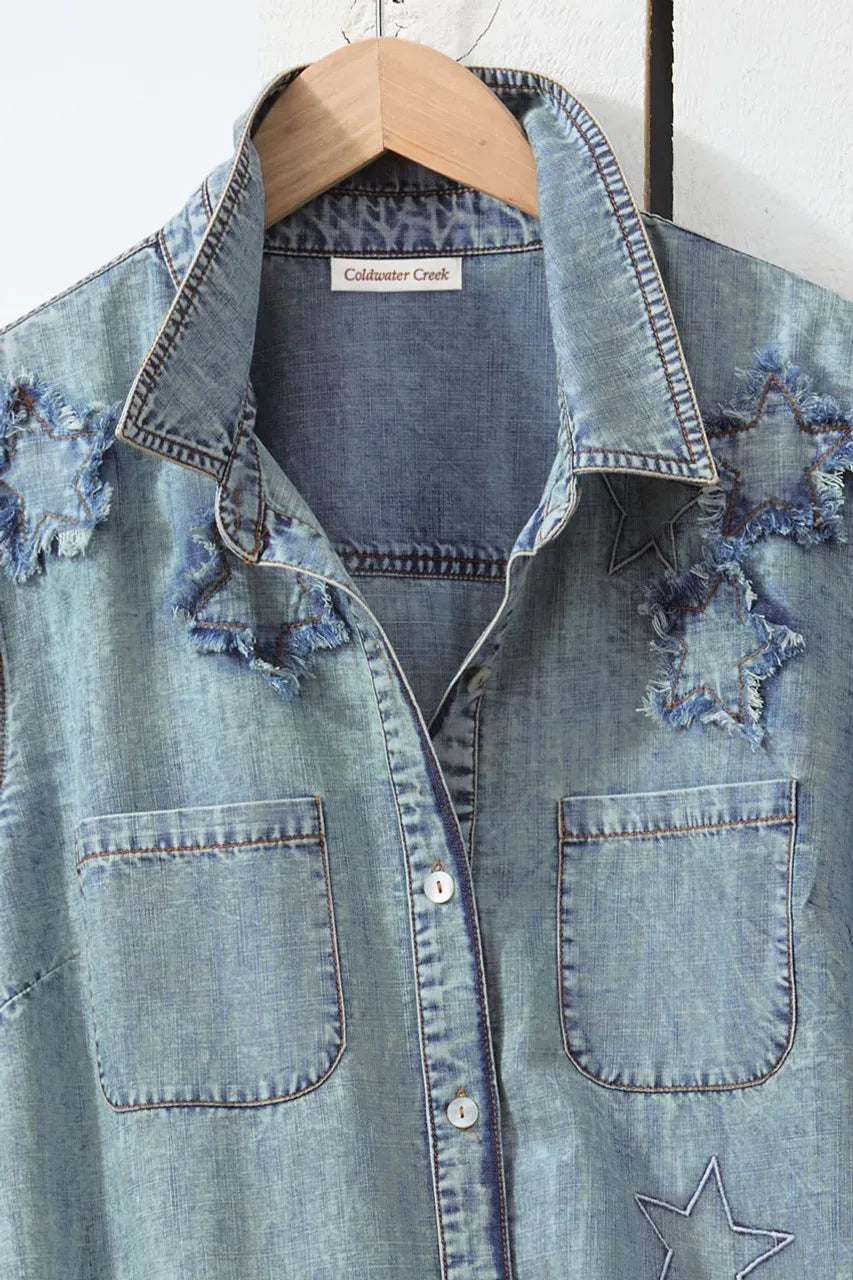 Product Description You’ll be the star this summer in this fun big shirt, embellished with embroidered and appliquéd stars with frayed edges. Lightweight denim features a vintage wash and great drape and side-slit hem.