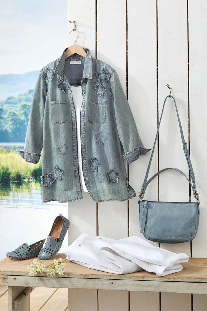 You’ll be the star this summer in this fun big shirt, embellished with embroidered and appliquéd stars with frayed edges. Lightweight denim features a vintage wash and great drape and side-slit hem.