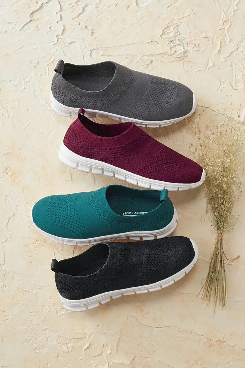 Product Description Ultra-light and easy, these slip-on sneakers are designed for effortless, all-day wear. Textured, breathable knit uppers with pull-on heel tabs and cushioned footbeds provide exceptional comfort. The flexible construction moves naturally with your foot while maintaining support during extended wear. A perfect balance of performance and casual style. 1" wedges. Polyester/spandex, traction faux rubber soles.
