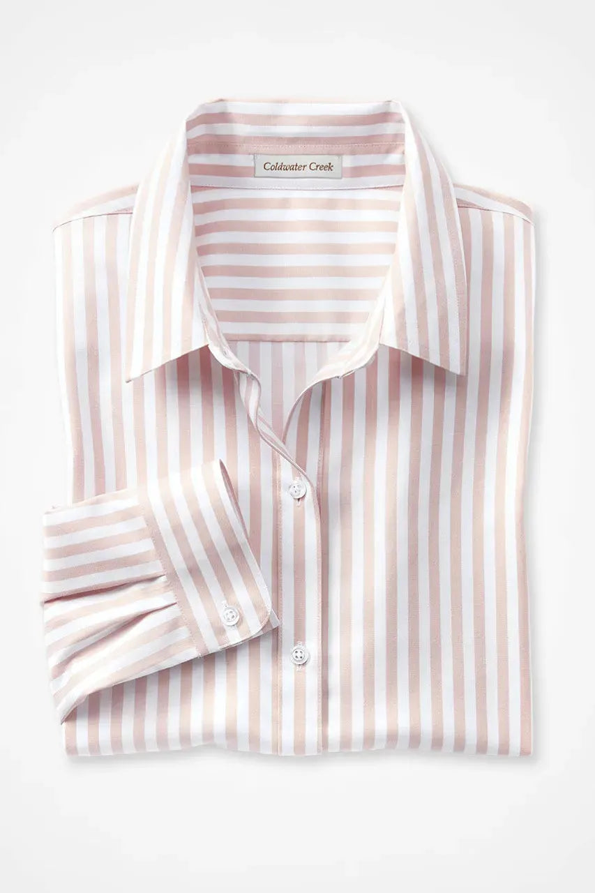 Product Description A clean-lined look in our essential, wrinkle-free no-iron striped shirt. Horizontal stripes add contrast on the back yoke, with reinforced front placket and curved hem.