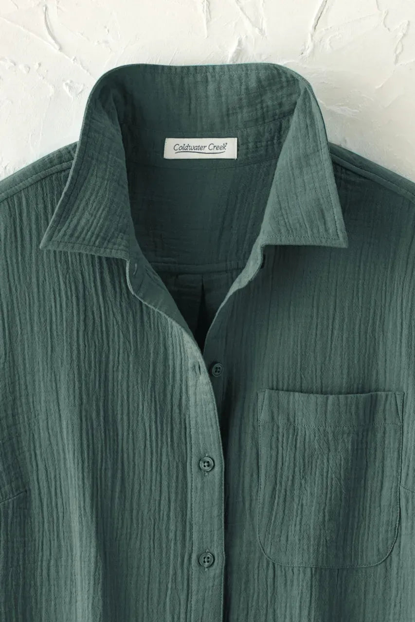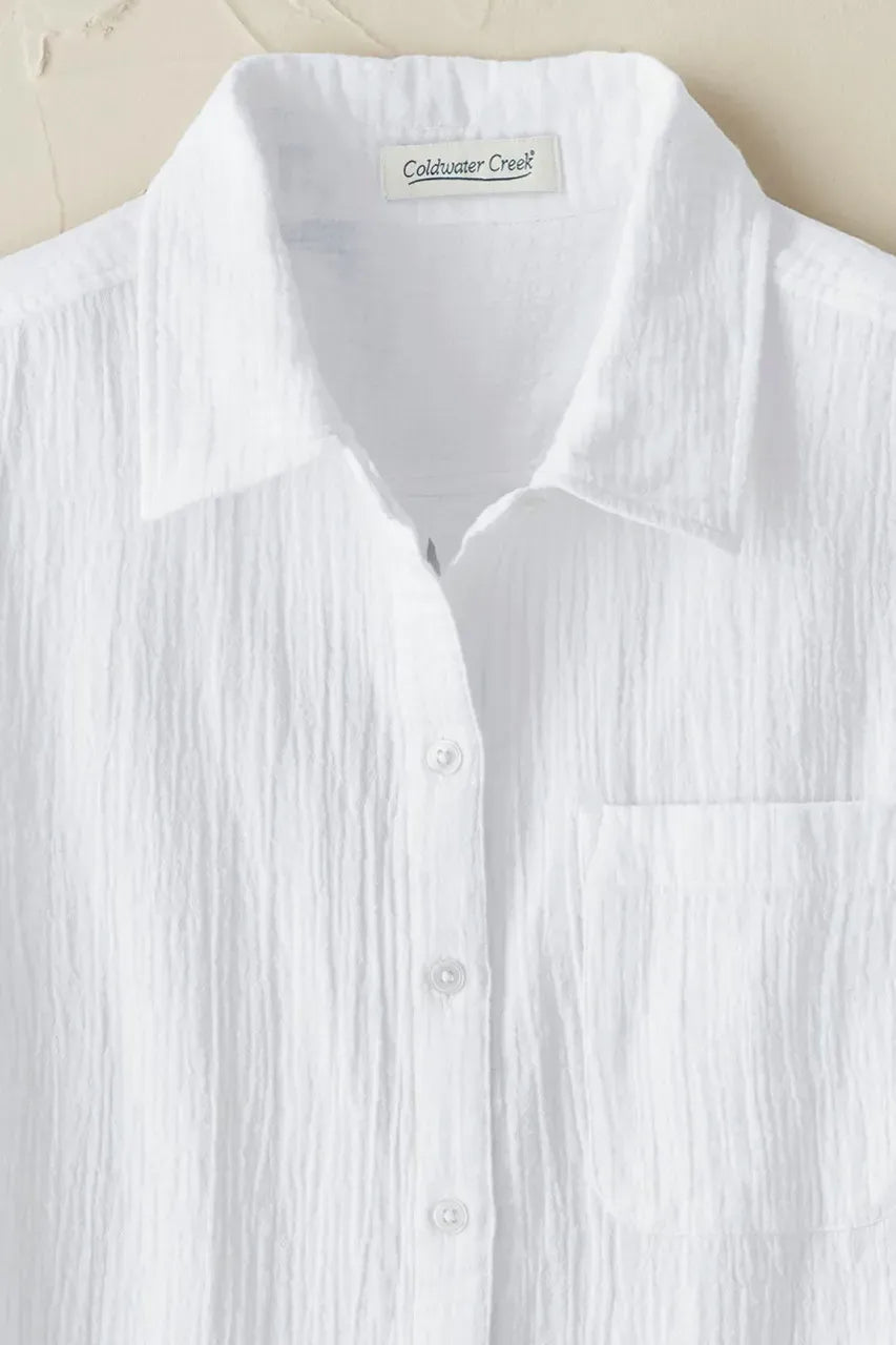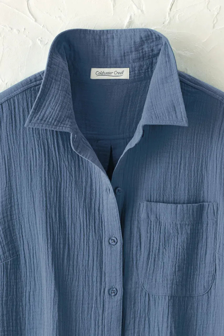 Our best-selling gauze, now in a favorite silhouette. Enjoy the breathability of pure cotton double gauze, with the versatility of a camp shirt – so easy to wear either solo or open with tank. Pleated back yoke, curved hem, front patch pocket. Imported.