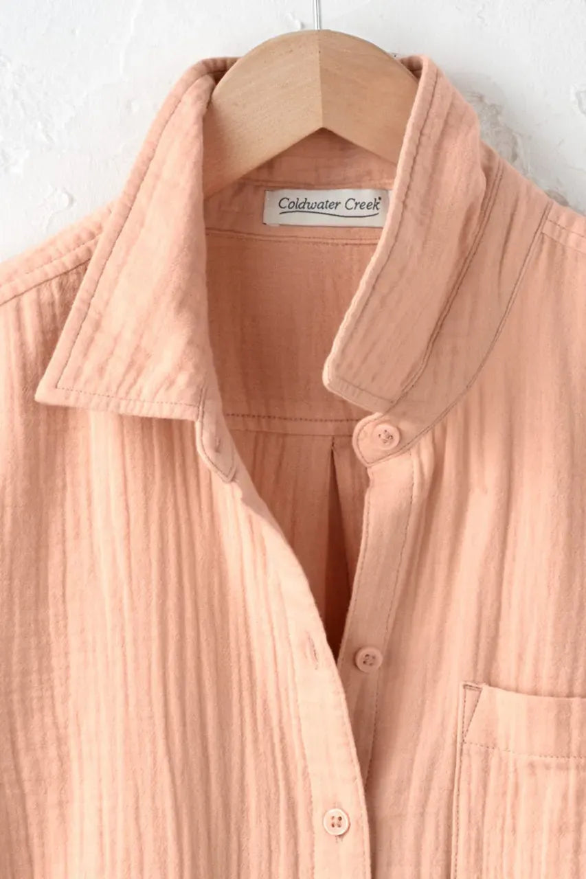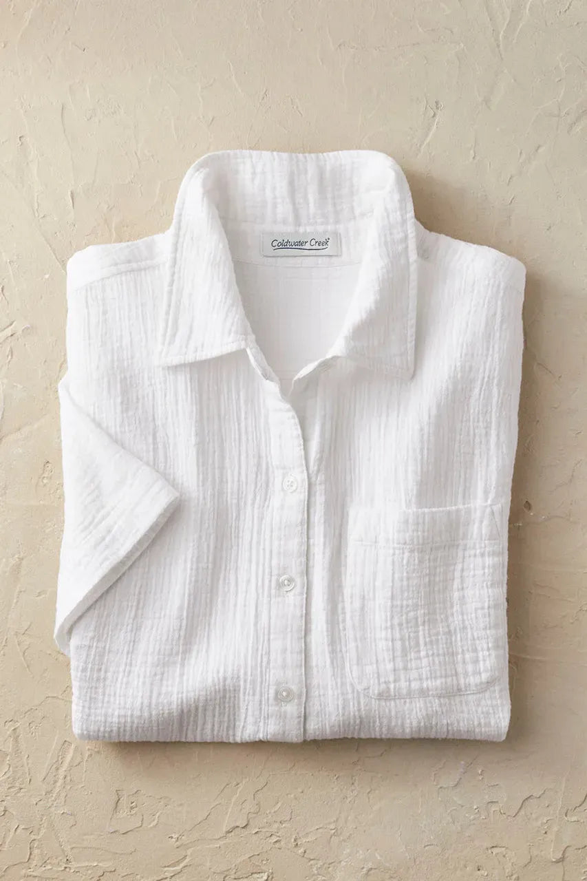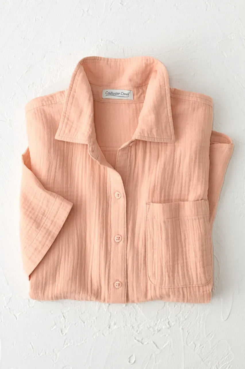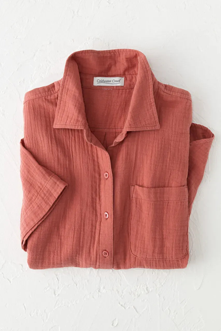 Our best-selling gauze, now in a favorite silhouette. Enjoy the breathability of pure cotton double gauze, with the versatility of a camp shirt – so easy to wear either solo or open with tank. Pleated back yoke, curved hem, front patch pocket. Imported.