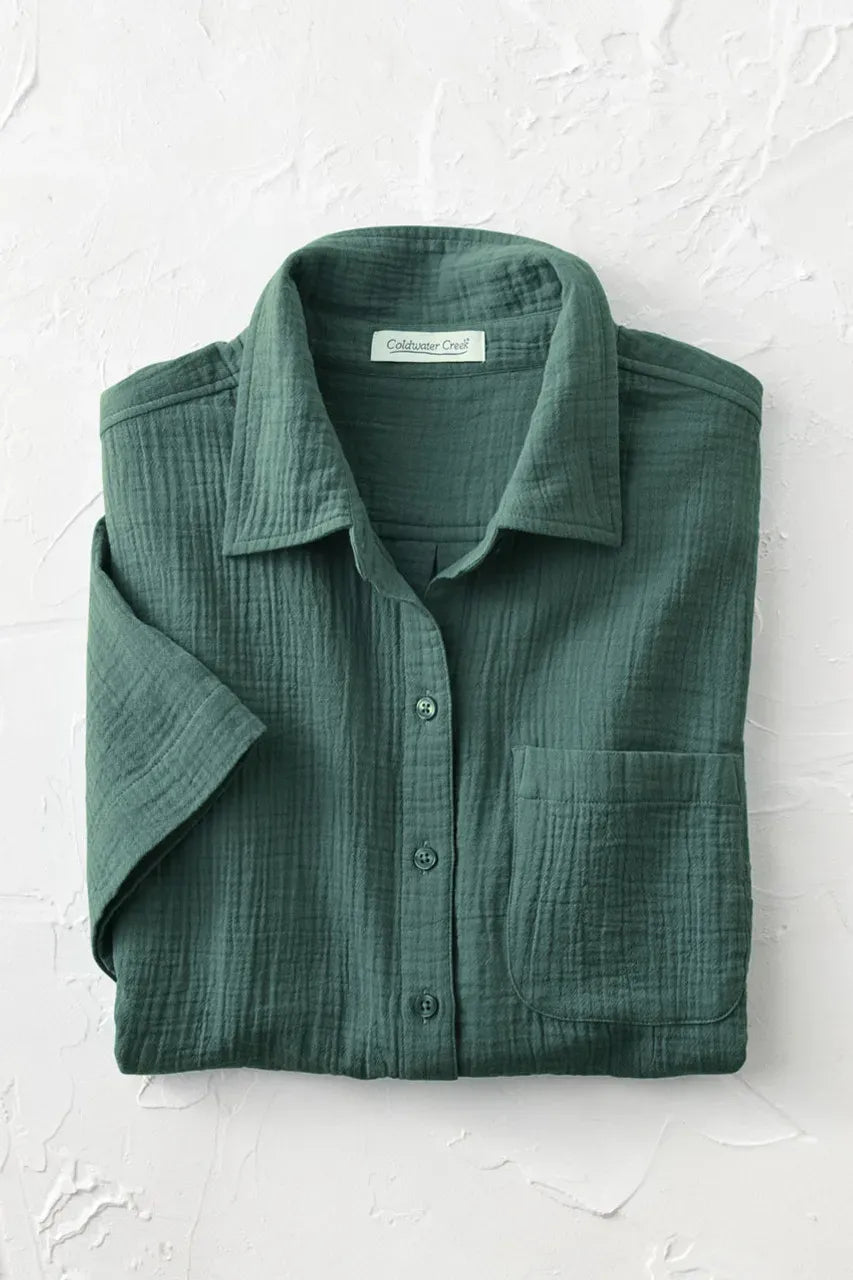 Product Description Our best-selling gauze, now in a favorite silhouette. Enjoy the breathability of pure cotton double gauze, with the versatility of a camp shirt – so easy to wear either solo or open with tank. Pleated back yoke, curved hem, front patch pocket. Imported.