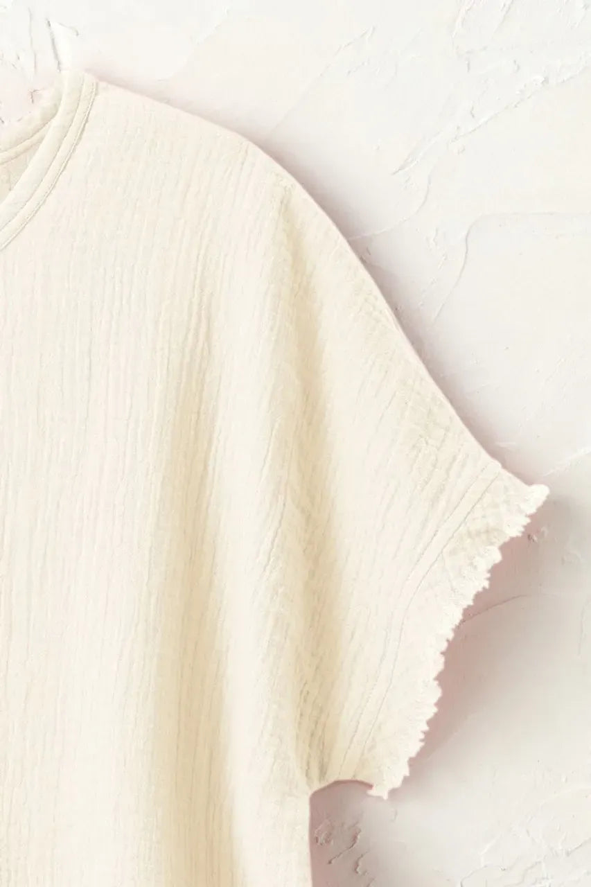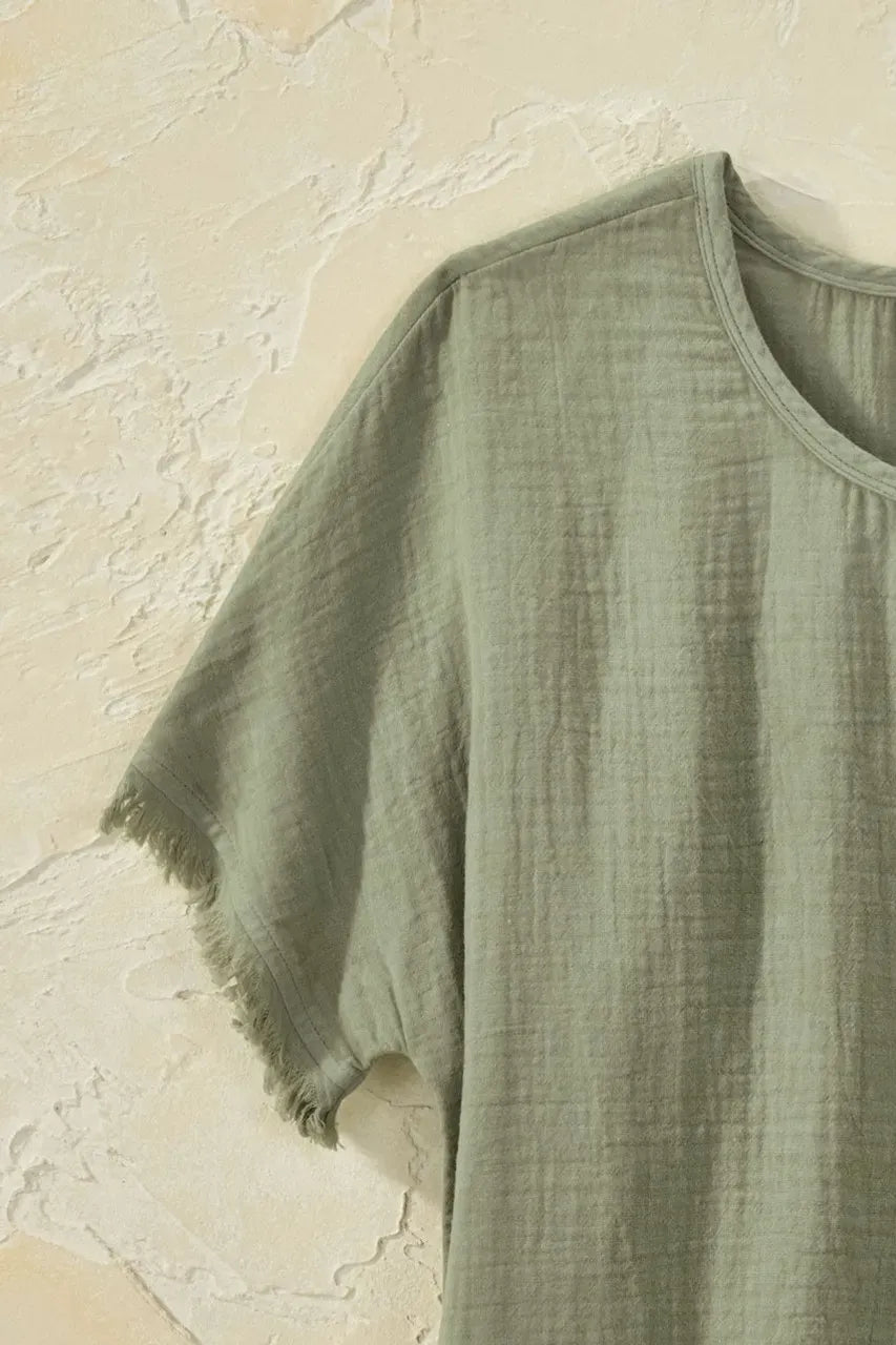 Product Description Our easiest summer breeze top ever – updated with a new flattering fit. Pure cotton double gauze is breathable and lightly textured, in a simple slipover design with a curved high-low hem. Dolman short sleeves have raw edges.