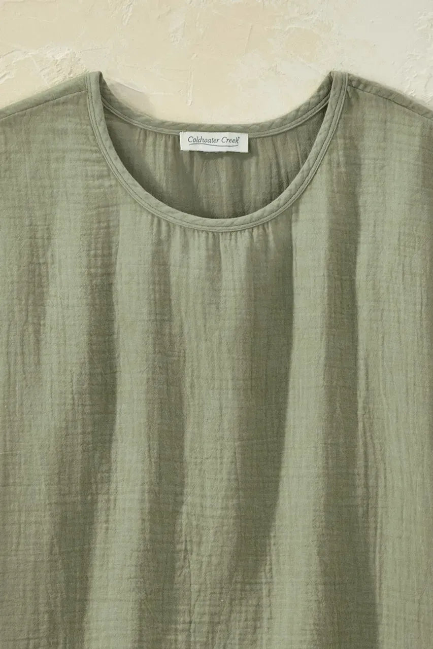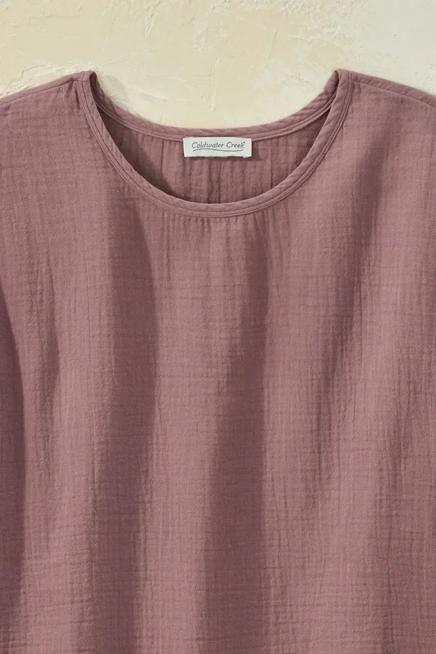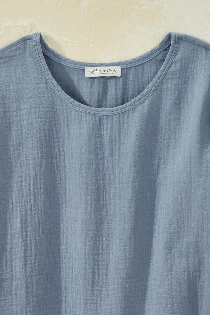 Our easiest summer breeze top ever – updated with a new flattering fit. Pure cotton double gauze is breathable and lightly textured, in a simple slipover design with a curved high-low hem. Dolman short sleeves have raw edges.