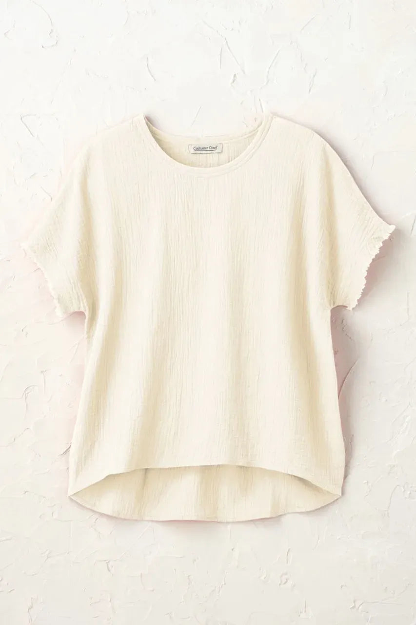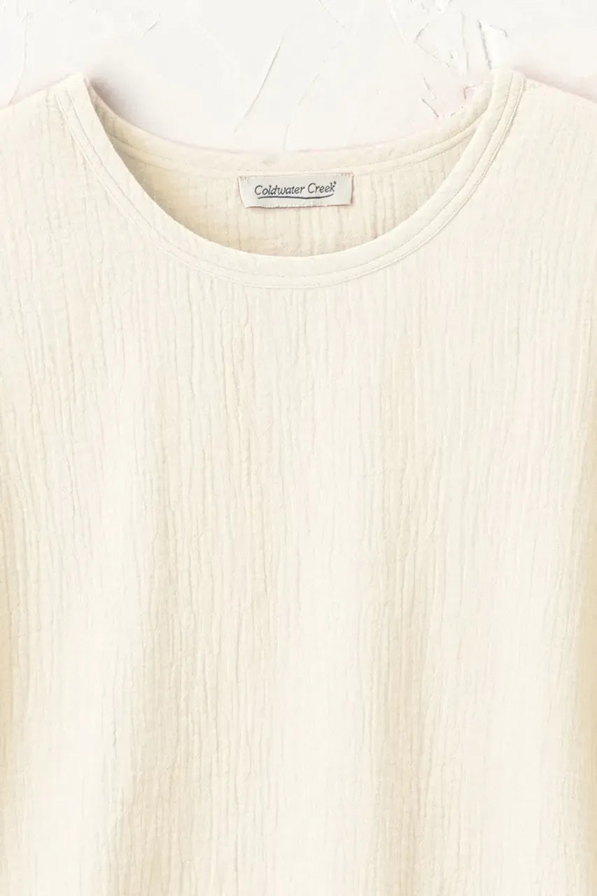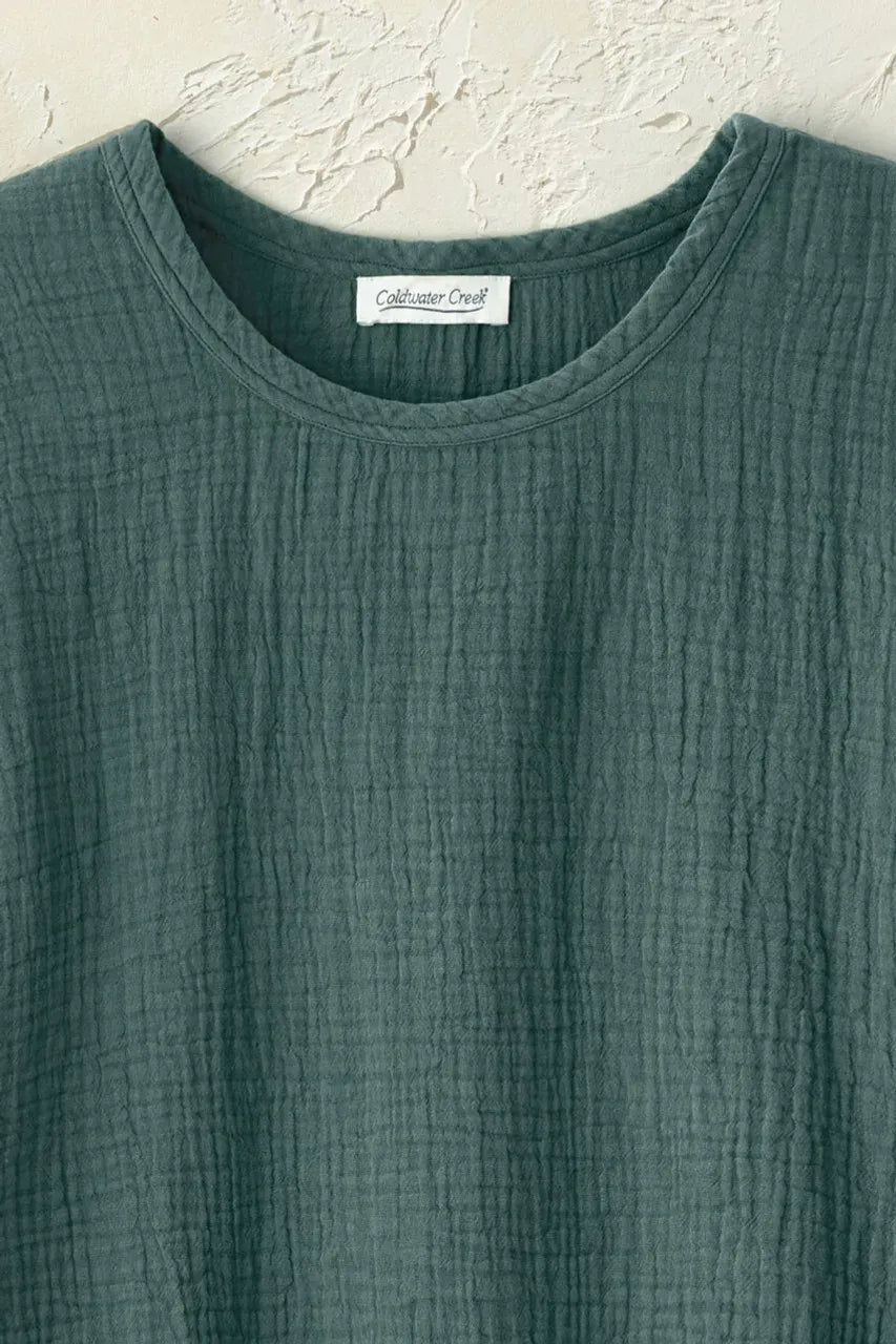 Our easiest summer breeze top ever – updated with a new flattering fit. Pure cotton double gauze is breathable and lightly textured, in a simple slipover design with a curved high-low hem. Dolman short sleeves have raw edges.