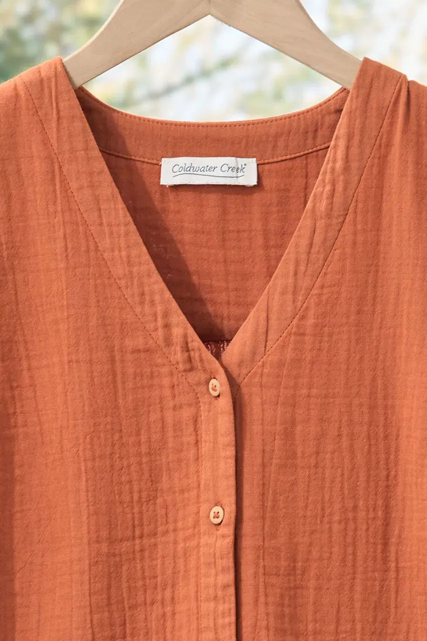 Product Description Our pure cotton double gauze shirt is designed with flutter sleeves for flowy ease and movement. Breathable and lightly textured, with a shirred back yoke, bust darts and side-slit shirttail hem.