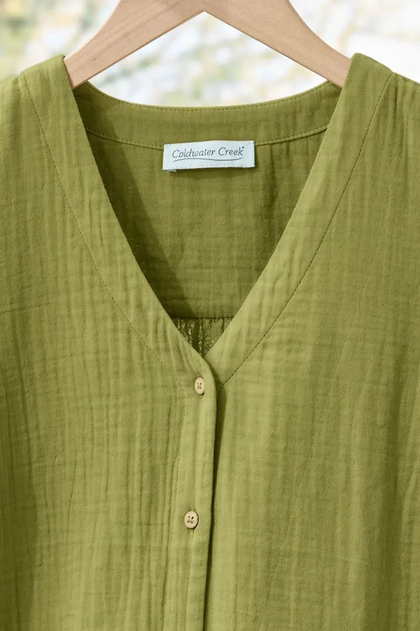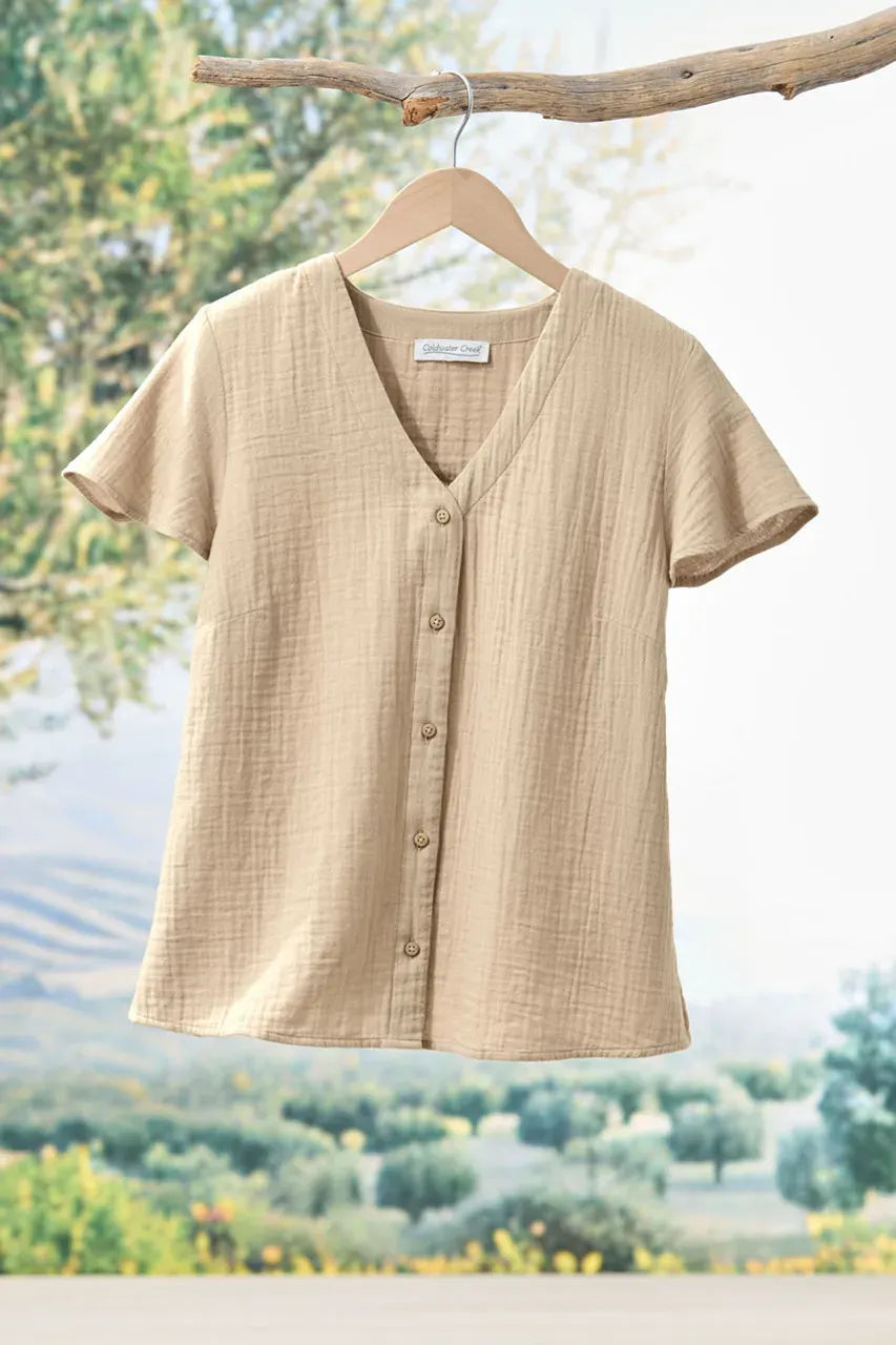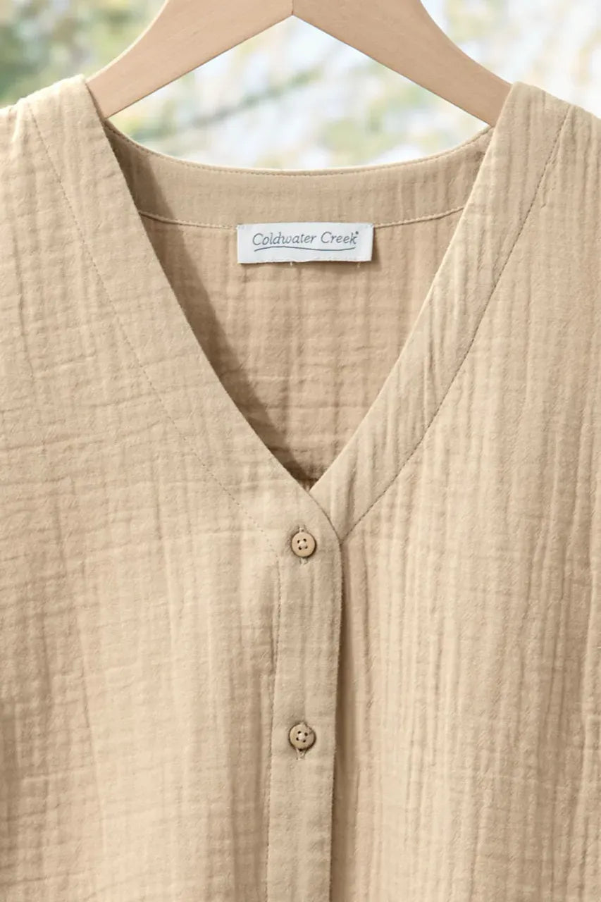 Our pure cotton double gauze shirt is designed with flutter sleeves for flowy ease and movement. Breathable and lightly textured, with a shirred back yoke, bust darts and side-slit shirttail hem.