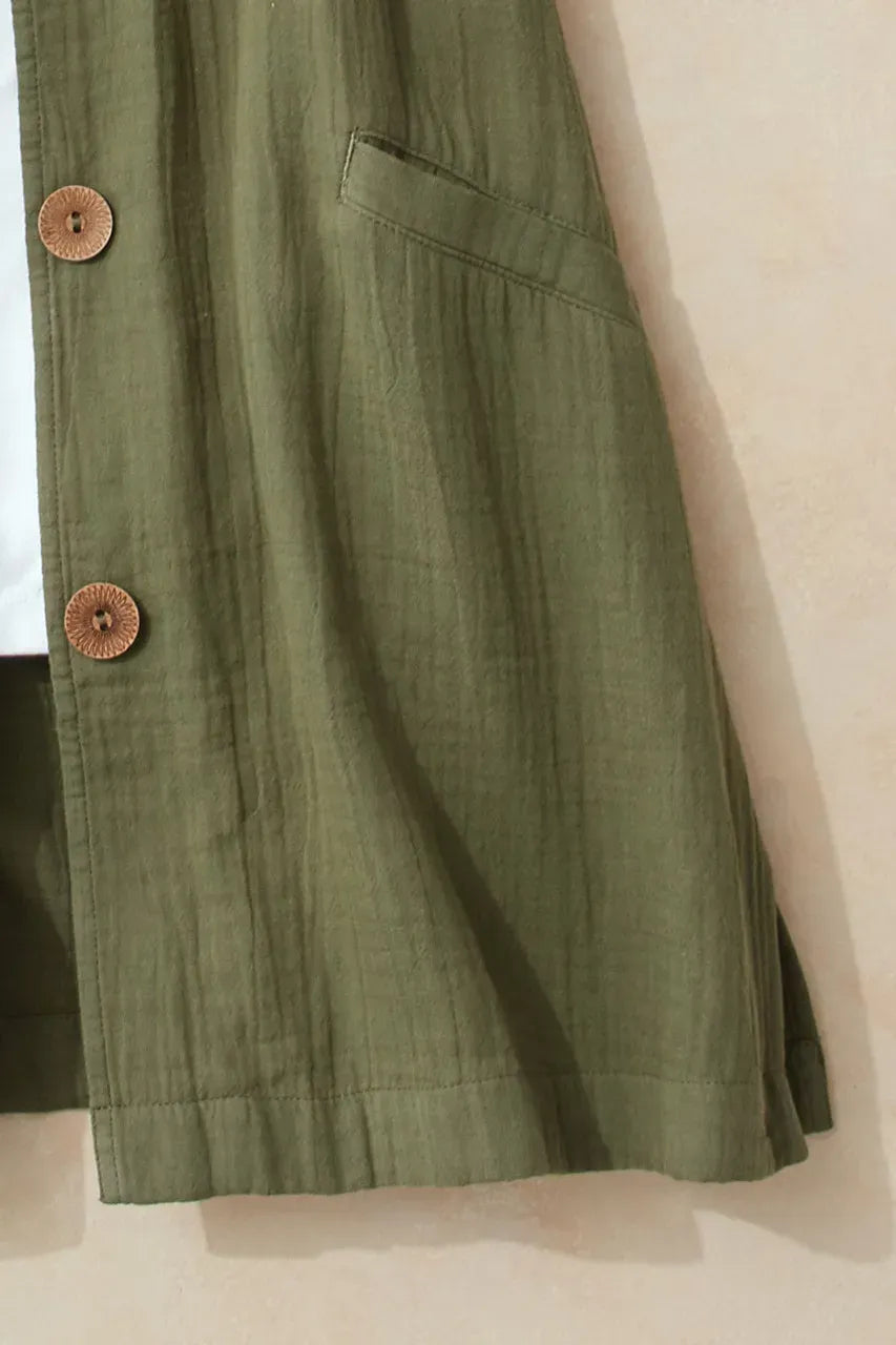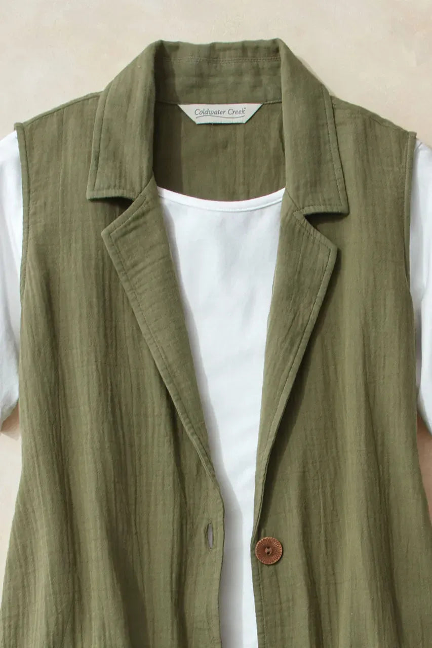 This button-front gauze vest pulls your look together effortlessly as a great, lightweight layering piece across seasons, or from day into evening. Styled with a shirt collar and slant pockets, with long side slits at the hem.